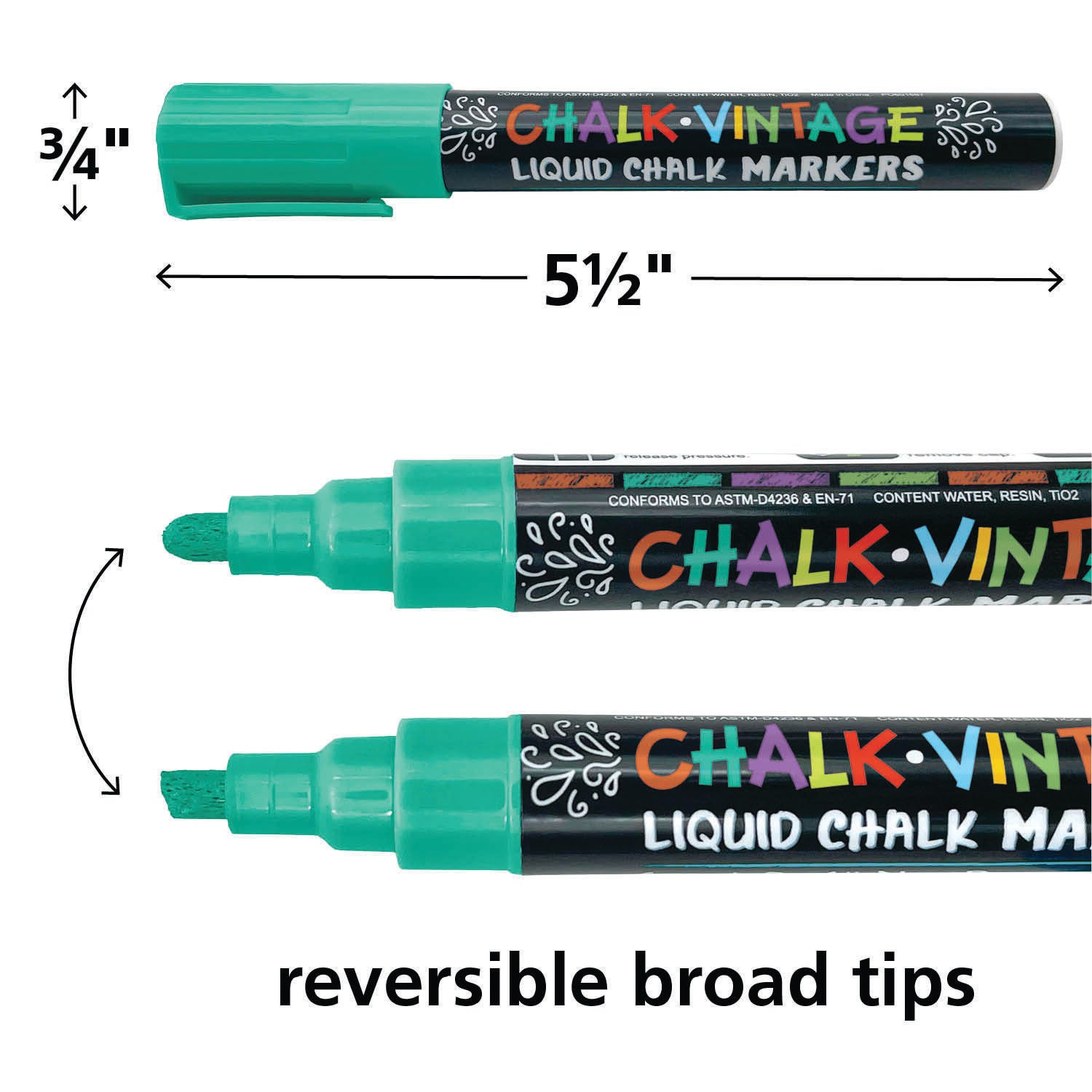 Get creative and colorful with these Chalk Brights Liquid Chalk Markers from Teacher Created Resources! These versatile markers boast unique reversible tips, with a bullet tip on one end and a chisel tip for drawing thick or thin lines. They are water-based, non-toxic, and wet-erase for easy cleaning. Just wipe with water to change up your art! These markers are suitable for use on all non-porous surfaces. Includes 8 markers. Recommended for ages 3 and up. Contains water, resin, and titanium dioxide (TiO2). This set of eight contains 8 markers, with one of each of the colors red, brown, yellow, green, blue, purple, teal, and bright green.Features