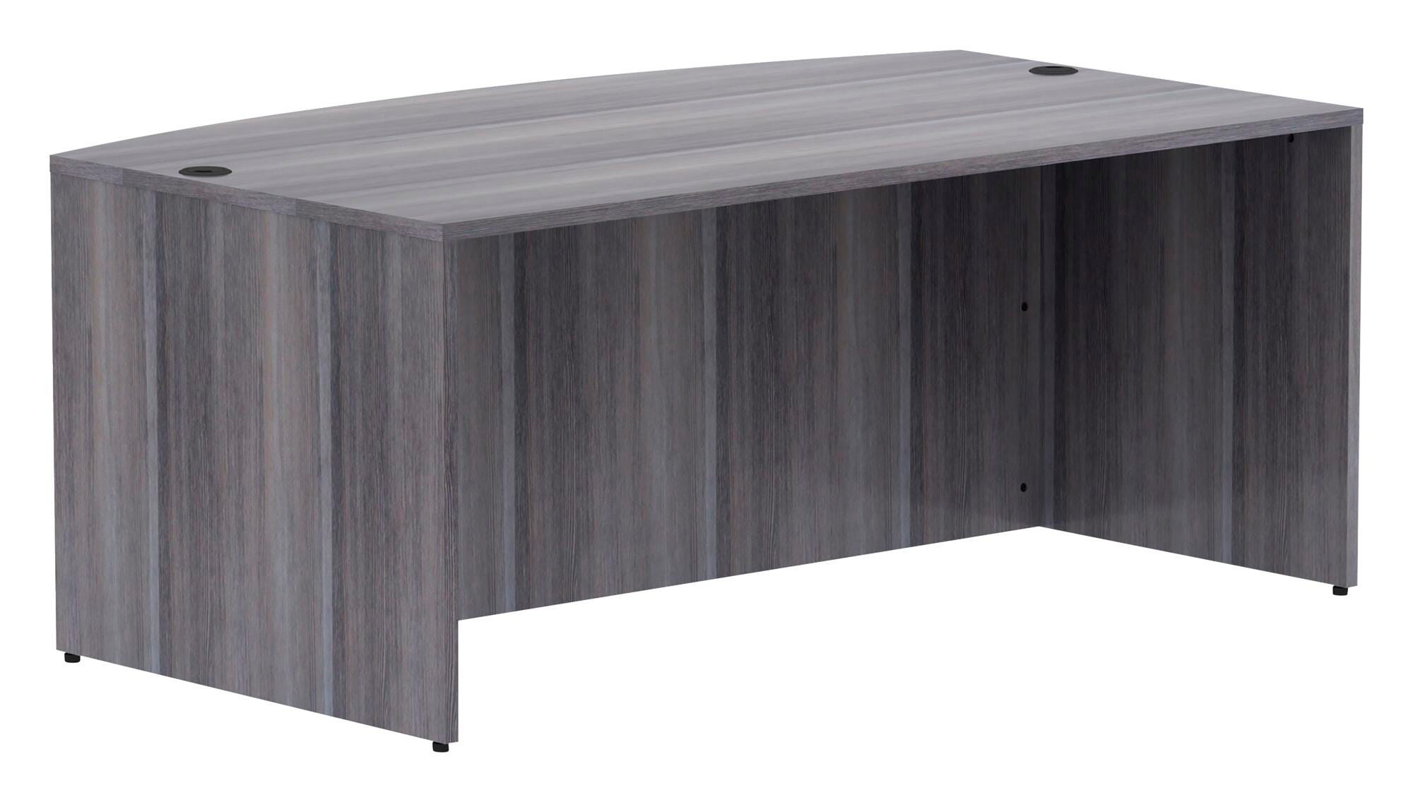 The bowfront desk shell is part of Classroom Select Series Laminate Furniture with high-quality laminate construction and metal-to-metal, cam-lock connections. The weathered charcoal laminate top is 1-inch thick for durability. You can use the two grommet holes in the top for easy cord routing, and the design also includes a full modesty panel for privacy, 3-millimeter PVC edges, and adjustable feet.Features