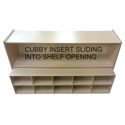The Childcraft® 10-Cubby Shelf Insert allows you to create customizable storage for classrooms, childcare centers, and learning spaces. This insert set includes 2 shelves and 6 dividers to convert one shelf into 10 individual cubby spaces, helping to keep supplies and learning materials neatly organized. The durable birch plywood construction ensures long-lasting use, while the versatile design fits into multiple Childcraft ABC Furnishings storage units (sold separately). The cubby shelf is perfect for enhancing classroom organization and creating a designated space for student belongings. Assembly required. The insert panels measure 46-3/4 W x 11-3/4 D x 12 H inches.Features