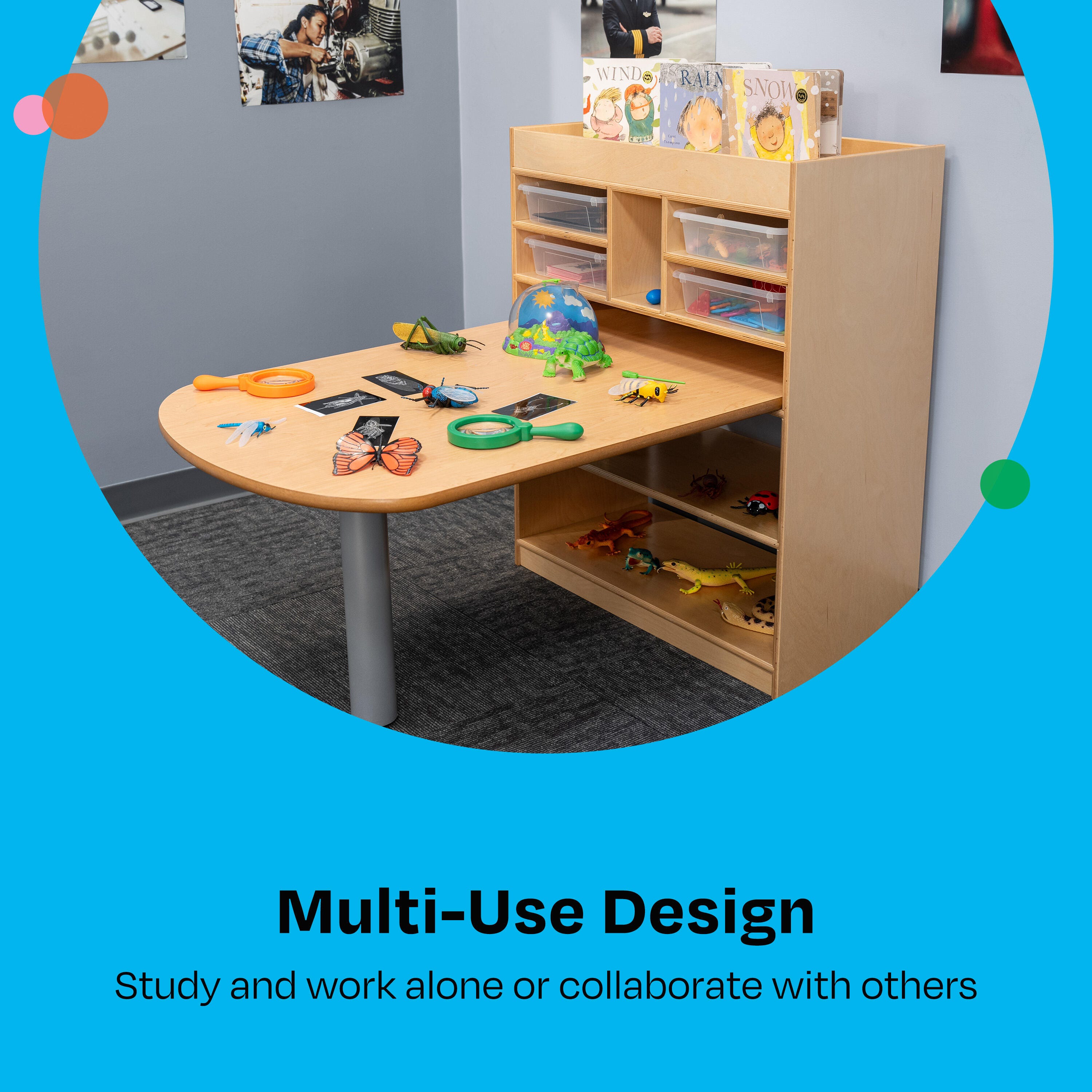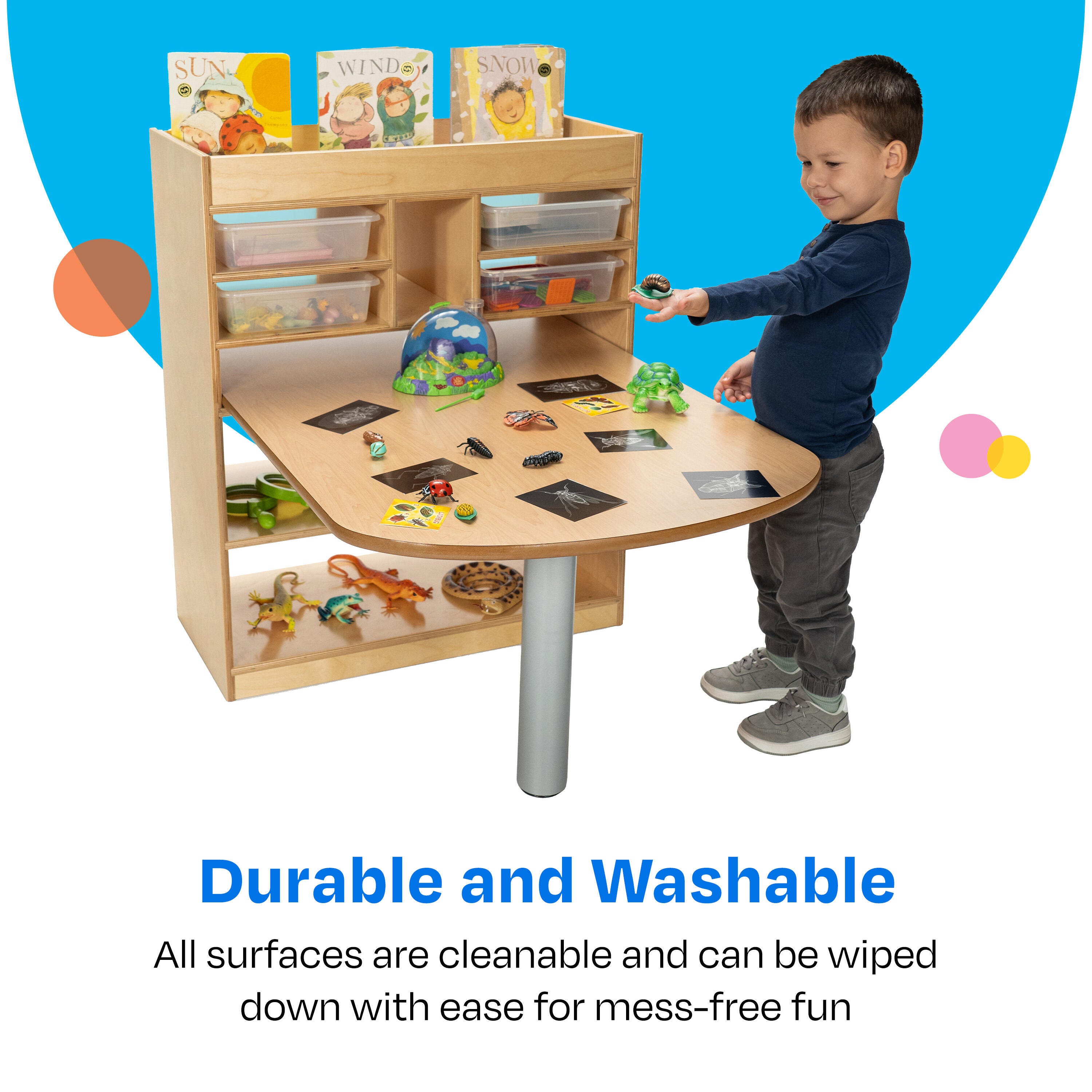 Childcraft® STEM Collaboration Table and Storage Unit invites children to explore and collaborate together. There’s plenty of space on the desk surface, along with top and bottom shelving for better organization. This workspace includes 4 clear bins. The convenient table accommodates sitting or standing for better comfort in early childhood classrooms. It’s durable and easy to clean. Use the STEM table for learning and playing, and keep spaces organized with storage for supplies, activities, and games. Light assembly is required, and the lab table includes instructions and hardware. This table with open shelving measures 30 W x 41-3/4 D x 36 H inches.