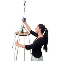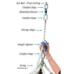 Abilitations Height Adjustment System securely suspends vestibular tools like moon swing, air walker, and the therapy net. System features one swivel device that clips easily to your properly installed ceiling bolt with the safety snap which accommodates a working load of 1000 pounds. System with smooth-acting roller bearing for free rotation includes one swivel device that features a solid metal body. System also comes with a 10 foot therapy rope with eye splice to enable the attachment of rope to the swivel device.Features