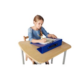 Working at an angle with a book or writing paper promotes the development of proper hand and wrist position for handwriting and fine motor skills, as well as good visual tracking. Features a low angle and is made of light weight Plexiglas. Encourages better posture and positioning for writing or reading. Slantboards measures 9 H x 14 W inches, with large metal clip to hold paper, and no slip discs to prevent sliding. Comes in Blue.Features