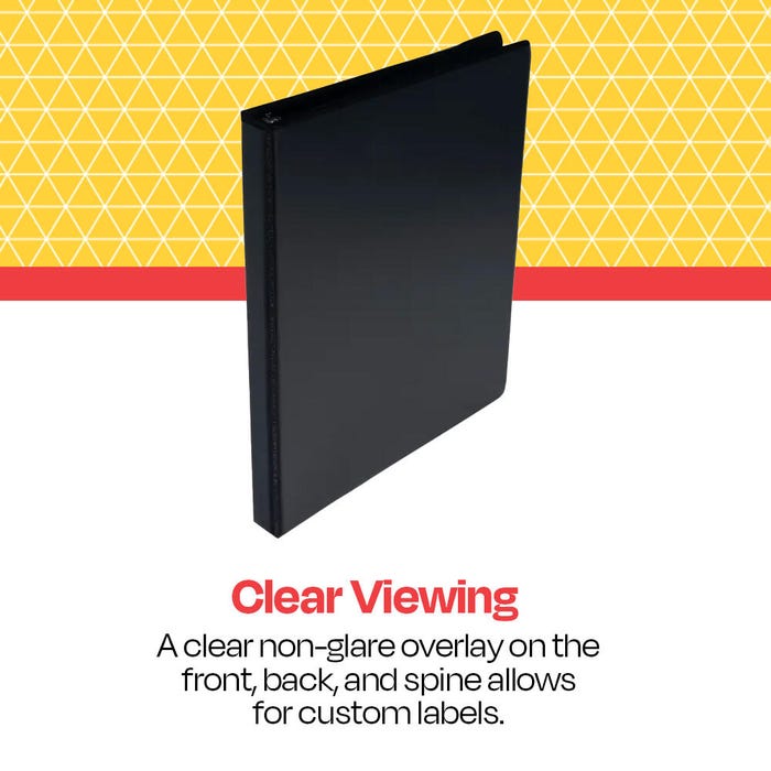 • Non-glare, PVC-free overlay on the front, back, and spine covers allows for customization on all three sides while ensuring ink from printed materials does not smear or transfer onto the half inch binder