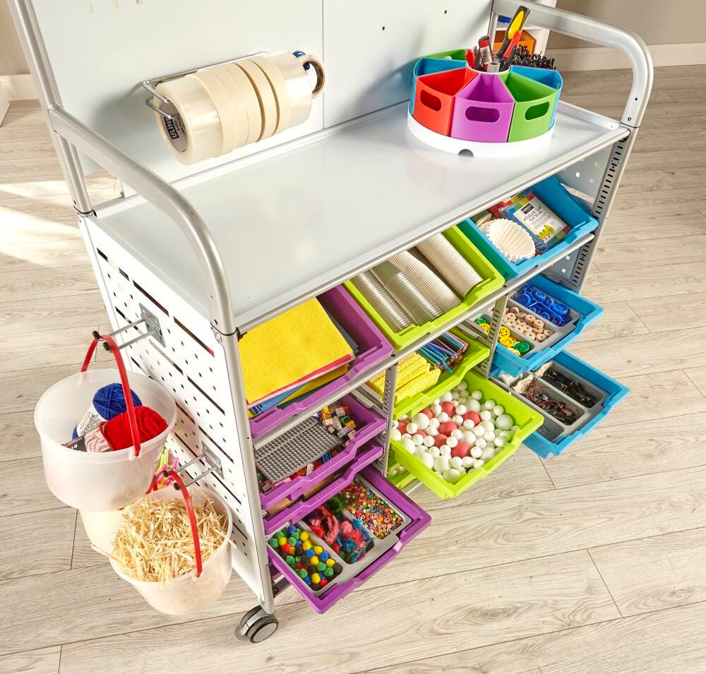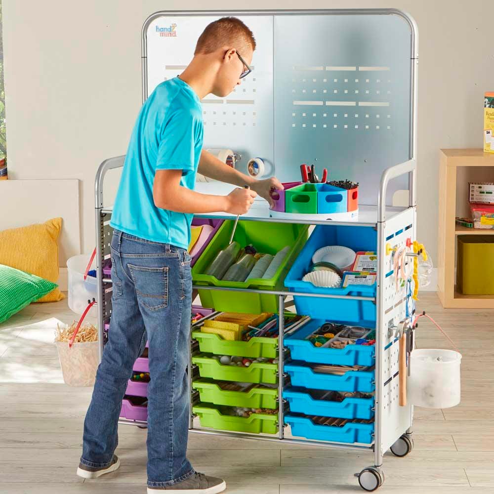 The STEM Lab Makerspace Cart includes everything needed to set up a makerspace in a classroom, STEM lab or library. Easy rolling, durable, metal cart comes already fully loaded with over 95 unique components: building materials, Strictly Briks®, craft supplies, electrical components, and tools perfectly organized to be easily accessible to middle school students. Also included are 72 Task Cards featuring open-ended, teacher-developed activities that span a variety of STEM concepts and appeal to children’s unique interests and learning styles and a teacher's guide. Activities are NGSS-aligned. Cart measures 61 x 40 x 17 inches and each drawer contains organizers to keep the included materials easy to find and use. Additional organization tools include two pegboards with moveable single and double hooks, buckets, a tape bar, spinning organizer with dividers, and hook magnets. The top portion of the cart serves double duty as both a magnetic surface and a dry-erase white board.Features