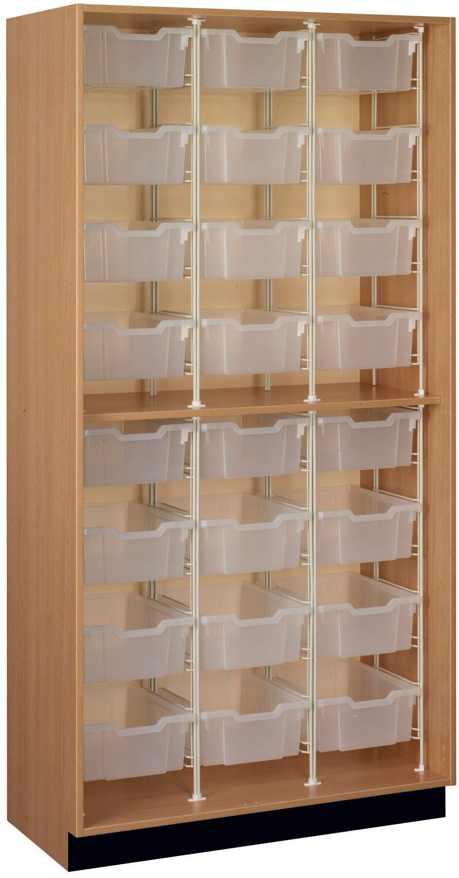 Bin Cabinet with 24 translucent bins and no doors is an ideal to keep contents organized and maximizes storage space while keeping the cabinet free from clutter. Cabinet features durable, easy to clean long lasting laminate finish that resists scratches, dents and other signs of use. Dual pin locking shelf supports allows flexibility of shelf placement without the worry of the shelves moving. Includes black base molding. Fully assembled cabinet comes with the commercial grade panels featuring full panel construction on all the sides. Measures 42 W x 23 D x 84 H inches. Note: Units must be securely anchored to a building structure.Includes: