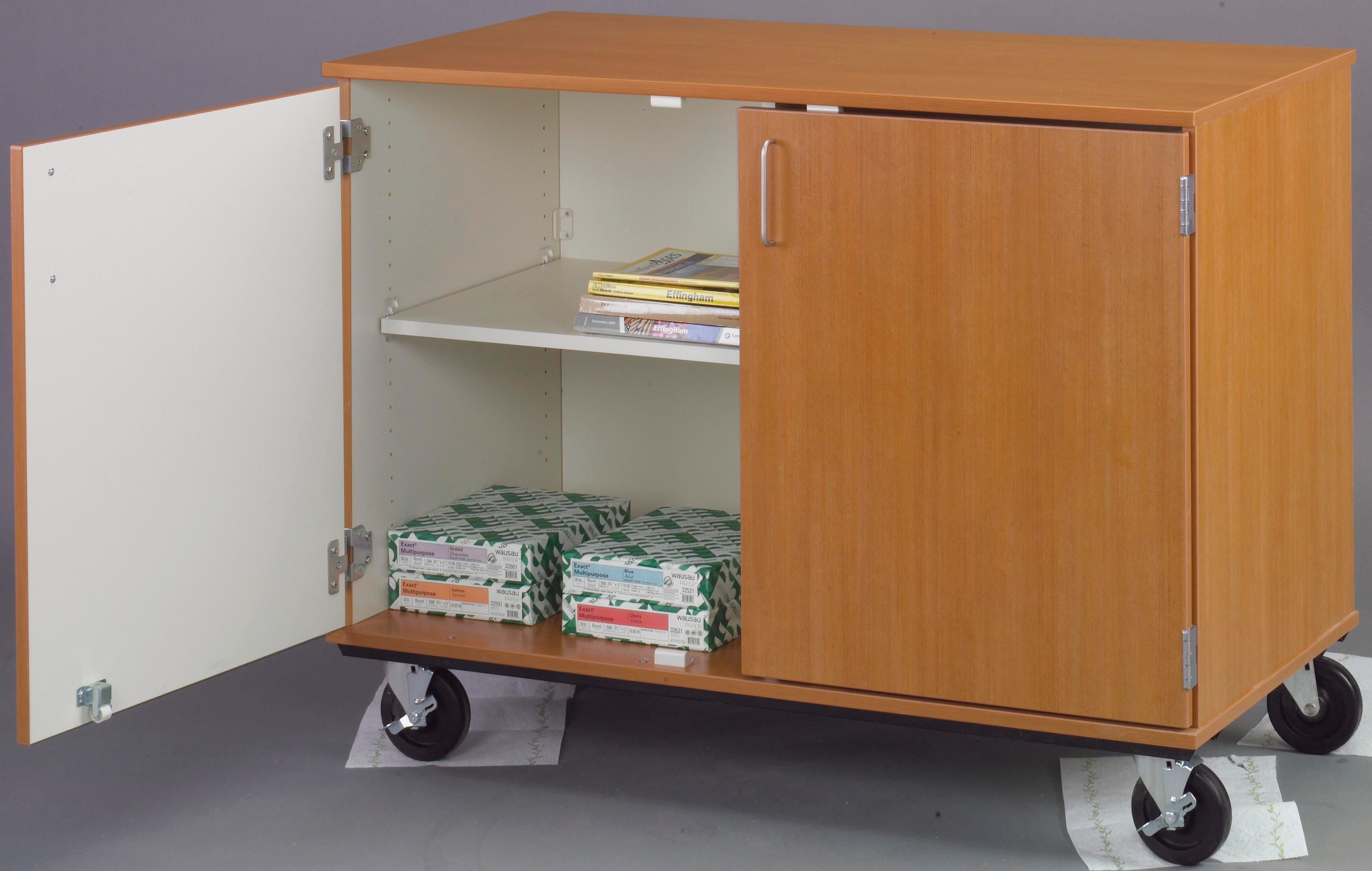 Designed with two adjustable shelves behind two solid doors, this mobile unit allows you to create the perfect compartment size to store your items, and the specially designed casters make it easy to roll your storage system to another classroom or out of the way in your classroom. Other features include a patented five-knuckle hinge system that allows the door to swing open to 270 degrees. Heavy duty, spring loaded door catches keep doors securely closed. Since this unit comes fully assembled, including the casters, it is ready to go! Measures 48 W x 24 D x 36 H inches.Features