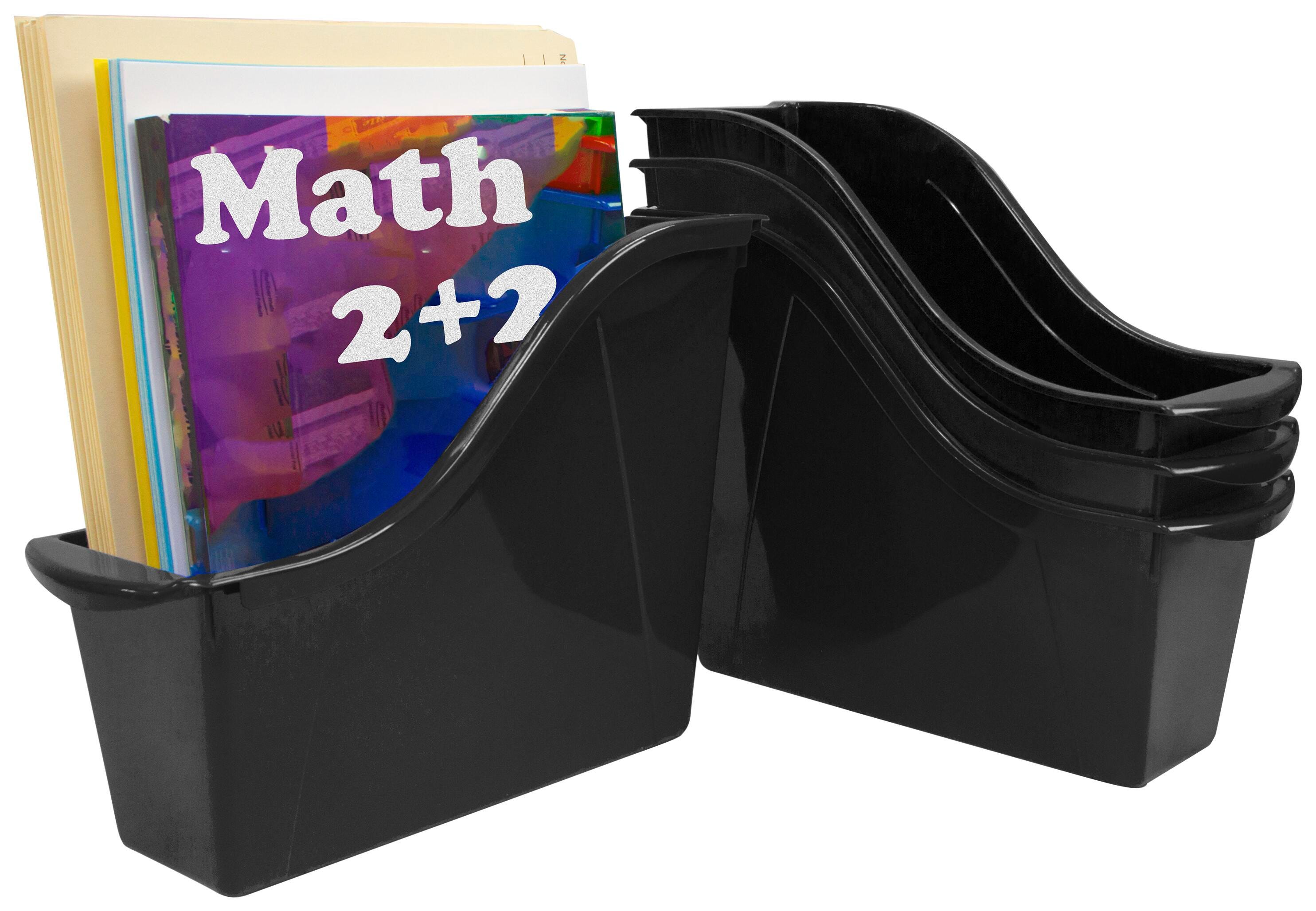 Keep your reading material organized and within easy reach with the Storex Interlocking Book Bin. This versatile plastic bin can be linked together with other Storex book bins to make a long, sturdy bookcase, and/or be used singularly to carry a set of books to your reading corner. The handles are perfectly sized for big and small hands. Small bin size (at 11-3/4 L x 8-1/2 H x 4-1/2 W inches) fits into narrow 12-inch bookcases and accommodates taller books and letter-size file folders inside. Black Bin is also available in other bright colors, which are all ideal for early childhood classrooms or STEM and STEAM material organization. Label pouches sold separately. Colors may vary.Features