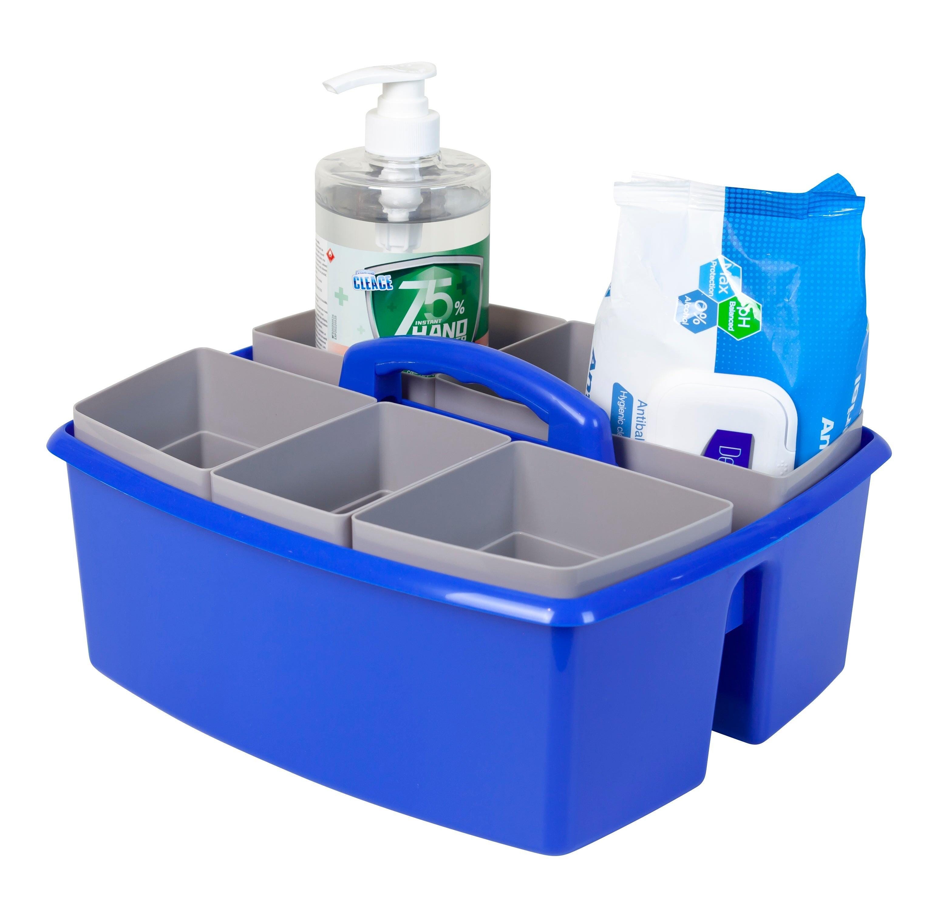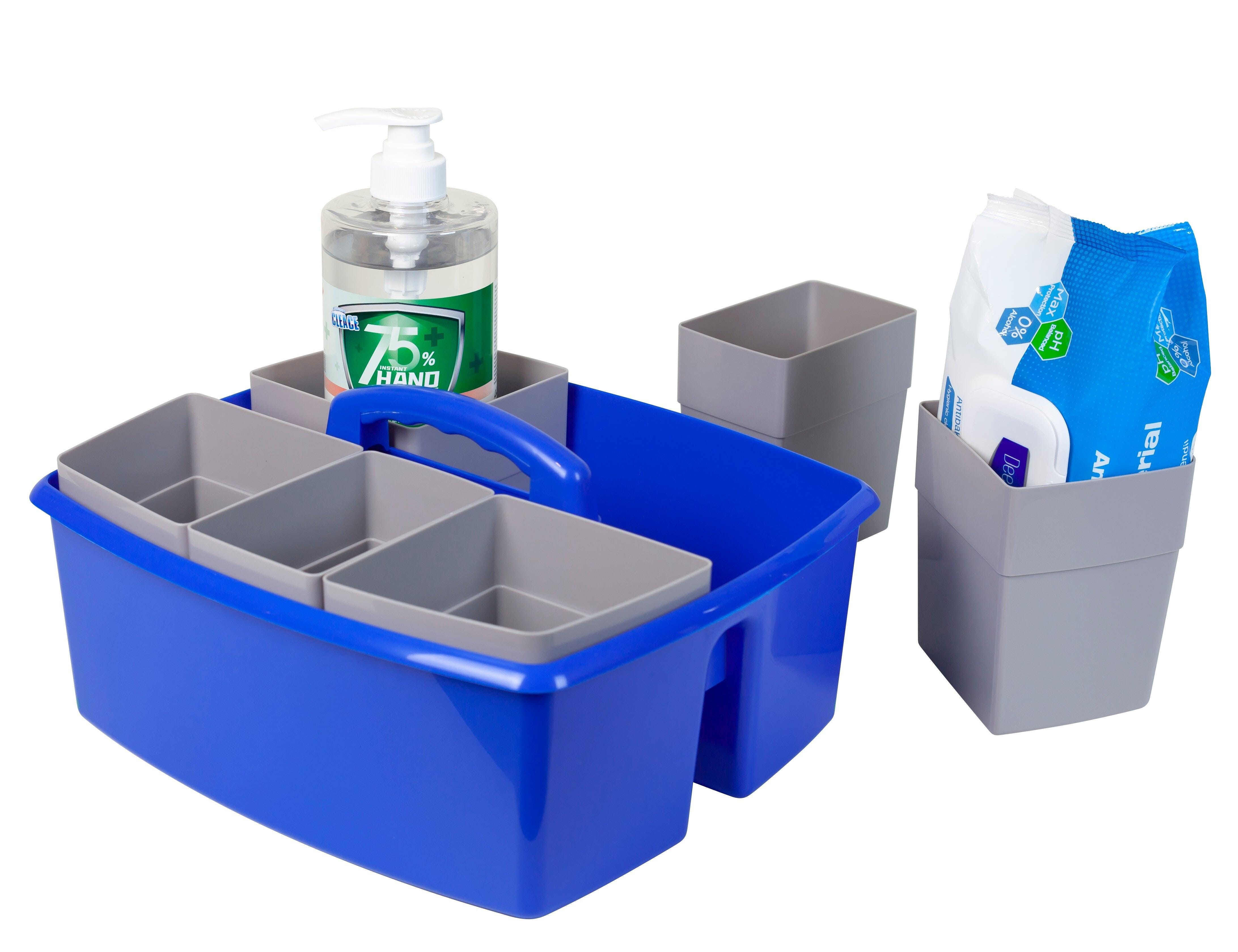 Stock up! This set of 2 caddies each contains two large compartments to store art supplies, cleaning supplies, or can be used as convenient technology storage or cell phone storage. Each has a comfort grip for easy carrying, as well as 6 cups that can be used to store smaller supplies like scissors, glue sticks, paint brushes, and other arts and crafts items. Cups can be taken out or placed in caddies as user sees fit. All caddies and storage cups are made of blue caddies, each with 6 separate sorting cups. Measures 13 L x 11 W x 6-3/8 H inches.Features