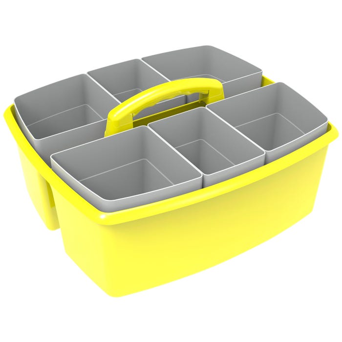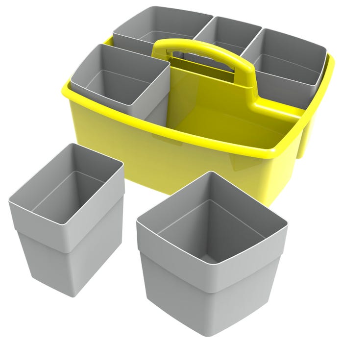 Stock up! This set of 2 caddies each contain two large compartments to store art supplies, washing accessories, or anything else you need to keep handy. Each has a comfort grip for easy carrying, as well as eve 6 cups that can be used to store smaller supplies like scissors, glue sticks, paint brushes, and other arts and crafts items; cups can be taken out or placed in caddies as user sees fit. All caddies and storage cups are made of durable (and dishwasher safe) plastic construction for easy care. Each divided compartment in caddy measures 11-1/4 L x 4-1/4 W x 4-1/2 D inches. Sold as set of 2 yellow caddies, each with 6 separate sorting cups. Colors may vary.Features