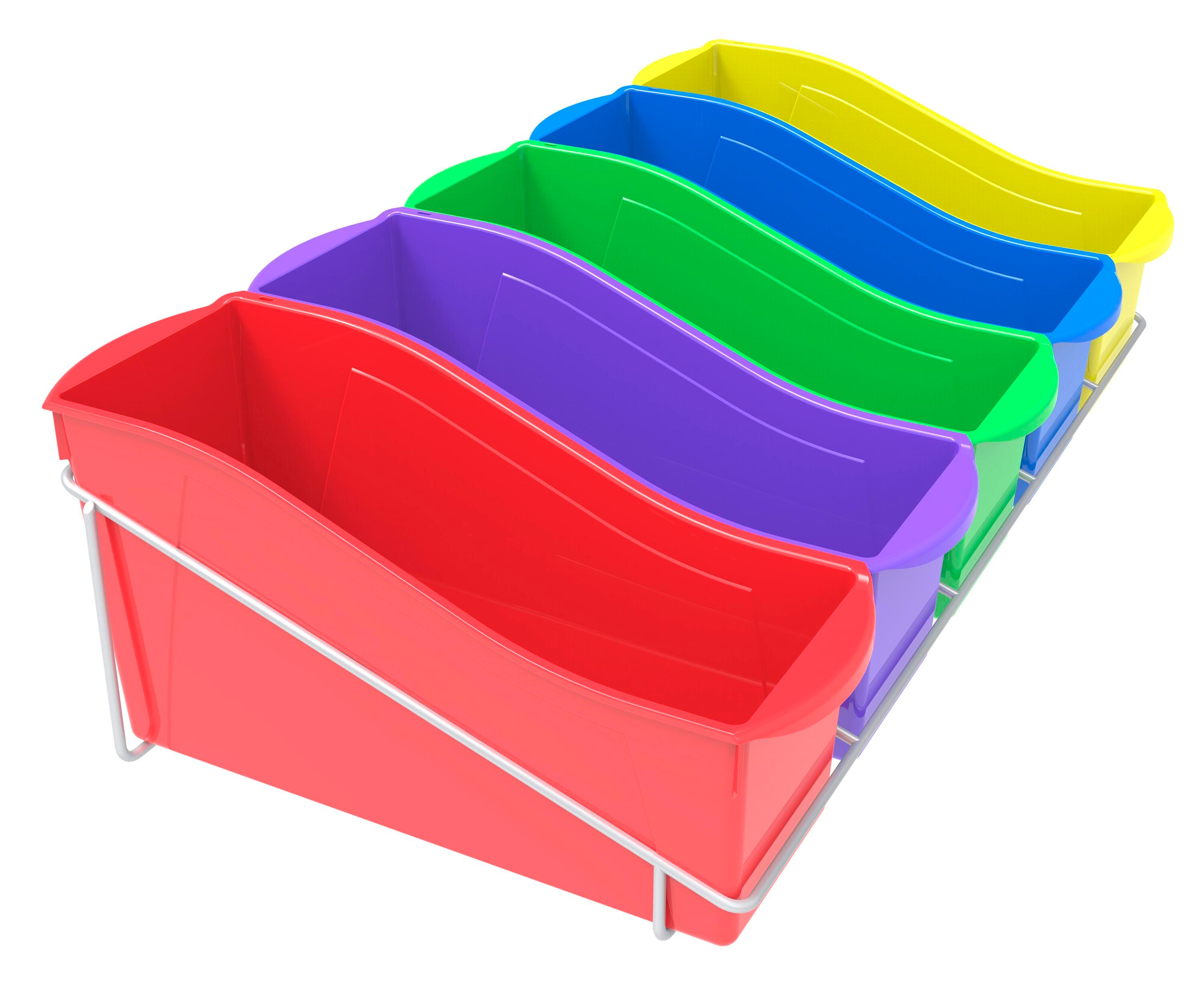 This set of 5 book storage bins includes a wire rack to instantly create an organized space. The metal wire rack is made with white epoxy coated steel for ultimate durability. The bins will not tip over when placed in the rack, even when they are overloaded with books. All the bins come in bright colors and feature integrated carry handles. Perfect for a reading corners or STEM / STEAM organizing. Fits on desktops or 15 inch shelves. Can be wall mounted; hardware not included. Assorted colors include Red, Yellow, Green, Blue, and Purple. Colors may vary.Features