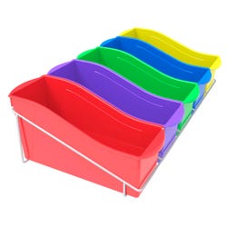 This set of 5 book storage bins includes a wire rack to instantly create an organized space. The metal wire rack is made with white epoxy coated steel for ultimate durability. The bins will not tip over when placed in the rack, even when they are overloaded with books. All the bins come in bright colors and feature integrated carry handles. Perfect for a reading corners or STEM / STEAM organizing. Fits on desktops or 15 inch shelves. Can be wall mounted; hardware not included. Assorted colors include Red, Yellow, Green, Blue, and Purple. Colors may vary.Features