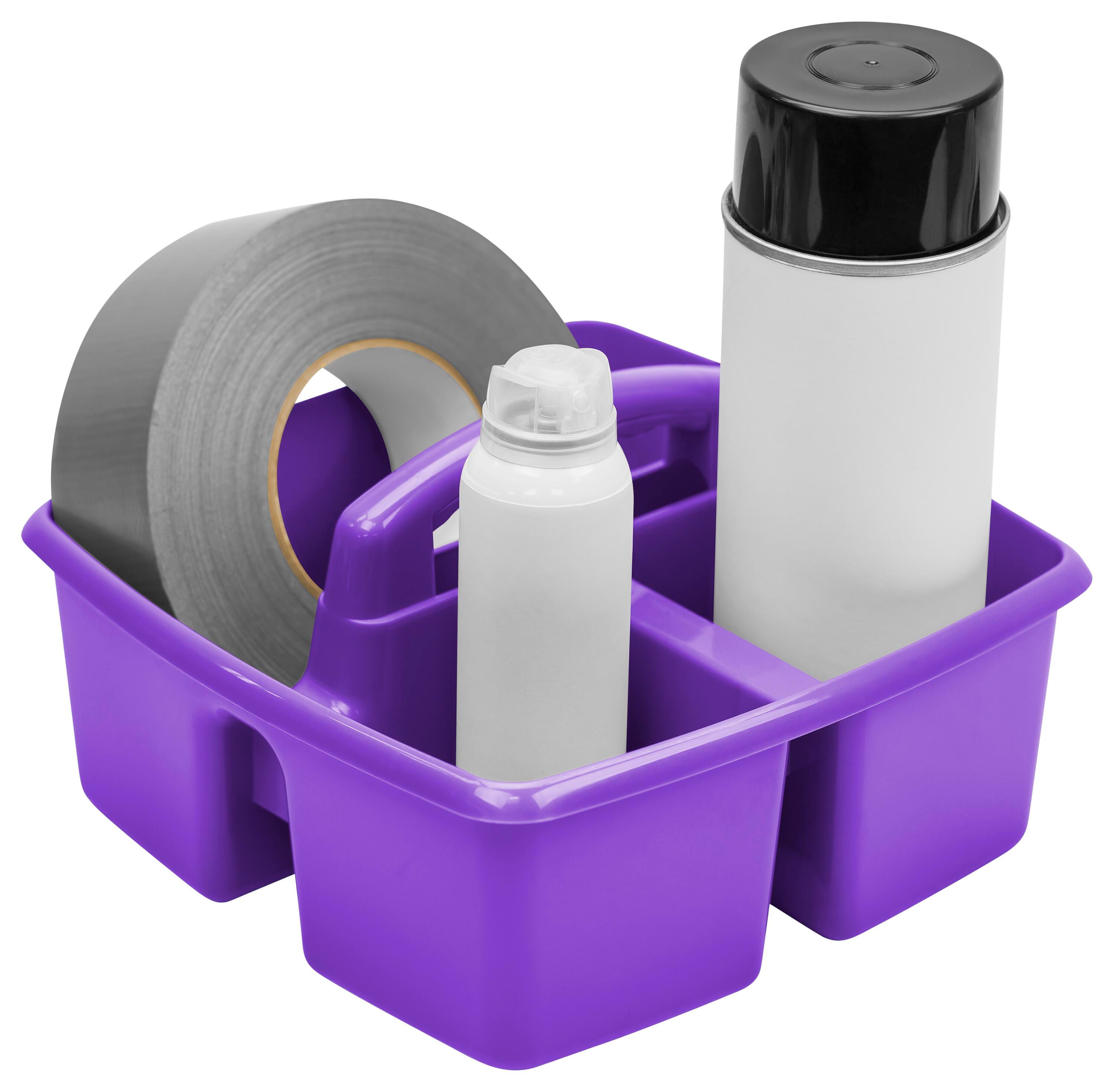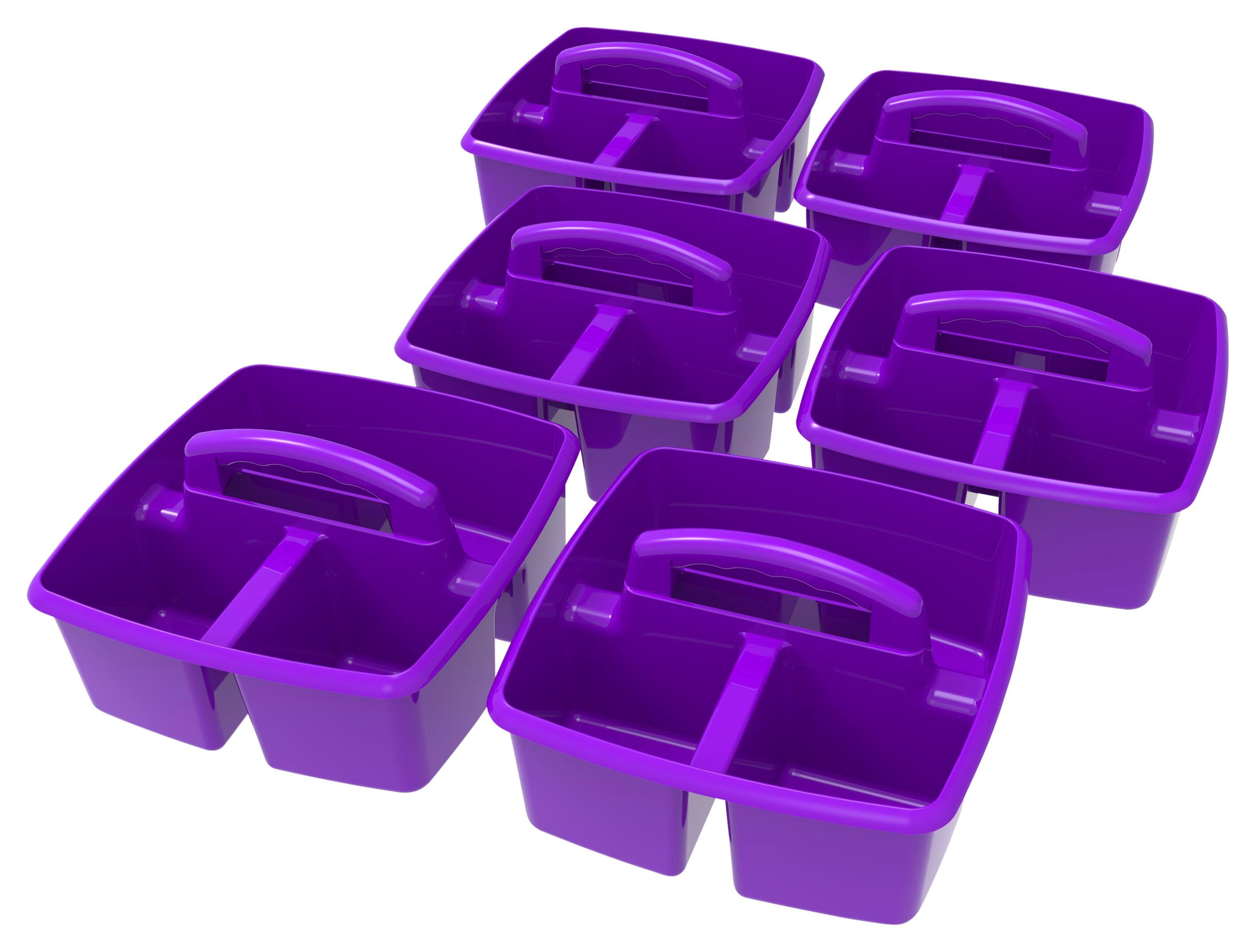 Sort (and transport) your supplies quickly and easily with the Storex Caddy. Design features 3 compartments, 1 large and 2 small, with rounded handles that have no sharp edges for a comfortable grip. The 2 small compartment interior dimensions are 3-1/2 L x 3-1/2 W x 3-3/4 D inches; the large compartment measures 8 L x 3-1/2 W x 3-3/4 D inches. Durable, drop-resistant plastic is also completely washable and dishwasher safe. Sold as pack of 6 (all in purple color). Colors may vary.