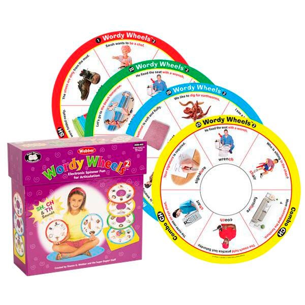 Encourage students to practice their target sounds at the word, phrase, and sentence levels. We’ve combined vibrant color photos with our electronic spinner to create Webber Wordy Wheels – SH, CH, and TH. Choose a Wordy Wheel, place it on the base, and line up the spinner with the spaces on the wheel. Now, get ready to play a great game that will also help students improve their expressive and receptive language skills.Features