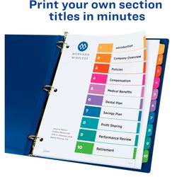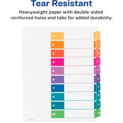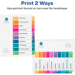 Avery 10-Tab Multicolor Ready Index 1 - 10 Table Of Contents Divider measuring 8-1/2 in x 11 in is a coordinated divider system which makes referencing easy by delivering a professional look. Divider compatible with typewriters and copiers is three-hole punched for use in binders. It quickly organizes with impact as well as prints or photocopies the section titles onto the table of contents pages. It has 2 in 1 tab design that lets you pick between portrait and landscape formats. Simply print the section titles onto the table of contents page using your inkjet or laser printer. Divider containing 30% post-consumer materials is sold as 6 per pack.Features