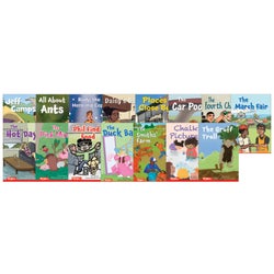 This fun and memorable second-grade set includes sequenced decodable books, #1–#15. Four books in this set are text-first books, offering decoding practice without illustrated clues first, then the text is repeated on the next spread with pictures. Each book includes a helpful family engagement page plus the phonics focus and high-frequency words learned. This set aligns with the Science of Reading and Structured Literacy.- This 15-book set includes: The Hot Day, The Pink Mink, Phil Finds Food, The Duck Ball, The Gruff Troll, The Smith’s Farm, Chalk Pictures, Jeff Camps, All about Ants, Rudy, the Hero in a Cape, Daisy’s Day, Places Close By, The Car Pool, The Fourth Chair, and The March Fair.