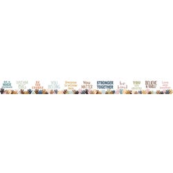 Liven up your classroom with Bordette Scalloped Border Trim! Straight-edge trim creates fresh themes and looks around bulletin boards, windows, walls, and class projects. This Welcoming Hands design features children's hands in varied skin tones across the bottom with empowering and empathy-building mantras above like "Be a Nice Human", "Stronger Together", "Everyone is Welcome Here", and more. Full classroom border package has 12 strips (each measuring 35 L x 3 W inches) for a grand total of 35 feet of bulletin board trim.Features
