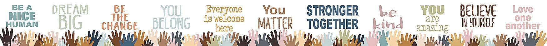 Liven up your classroom with Bordette Scalloped Border Trim! Straight-edge trim creates fresh themes and looks around bulletin boards, windows, walls, and class projects. This Welcoming Hands design features children's hands in varied skin tones across the bottom with empowering and empathy-building mantras above like "Be a Nice Human", "Stronger Together", "Everyone is Welcome Here", and more. Full classroom border package has 12 strips (each measuring 35 L x 3 W inches) for a grand total of 35 feet of bulletin board trim.Features