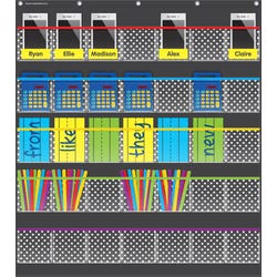 These lightweight and durable pocket charts feature colorful designs and hang easily from sturdy, metal grommets. 35 clear pockets measure 4-1/2 x 4-1/2 inches each and are perfect for organizing small items such as calculators, index cards, cell phones, white board erasers, and manipulatives. The non-porous surface is easy to clean and can be wiped-down or sprayed with disinfectant to help prevent the spread of germs. Chart measures 32-1/2 x 36-1/2 inches.Features