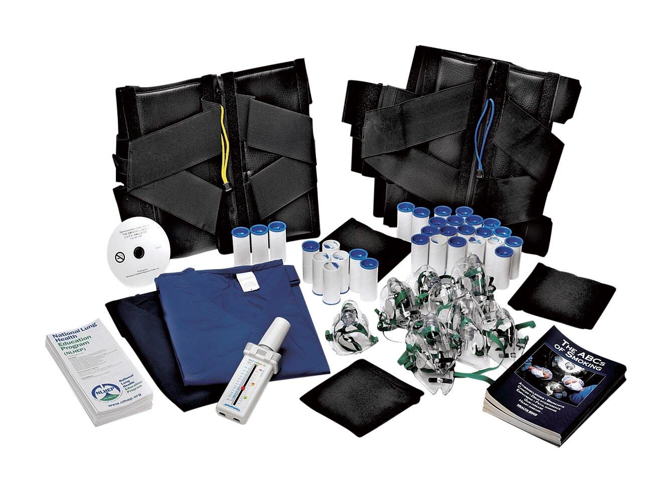 The Empathy Lungs® C.O.P.D. Simulator provides a powerful, hands‑on experience for smoking prevention and cessation education. The weighted, truss‑style garment and airway‑restriction mask work together to temporarily simulate the severe shortness of breath associated with C.O.P.D., asthma, and lung cancer. Users can immediately see reduced lung capacity by comparing before‑and‑after Peak Expiratory Flow (PEF) readings using the included mechanical peak flow meter. The simulator includes: Two chest constrictors (small and large), three weighted pouches, 30 disposable airway‑restriction masks, mechanical peak flow meter (50–800 liters per minute PEF flow range), 30 disposable one‑way mouthpieces, 30 patient booklets, thirty brochures, 30 informed‑consent forms, instructor’s manual, laminated breathing flashcard, 30‑minute training DVD, and two cover‑up shirts. Made in the U.S.A.Features