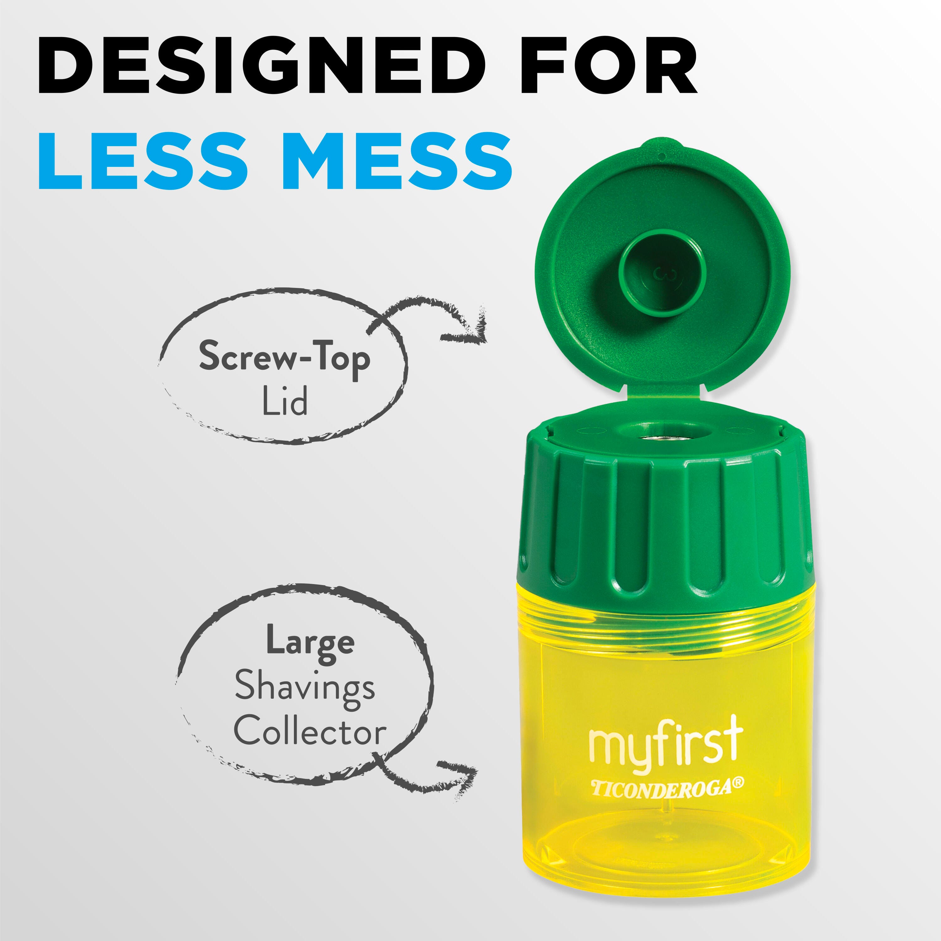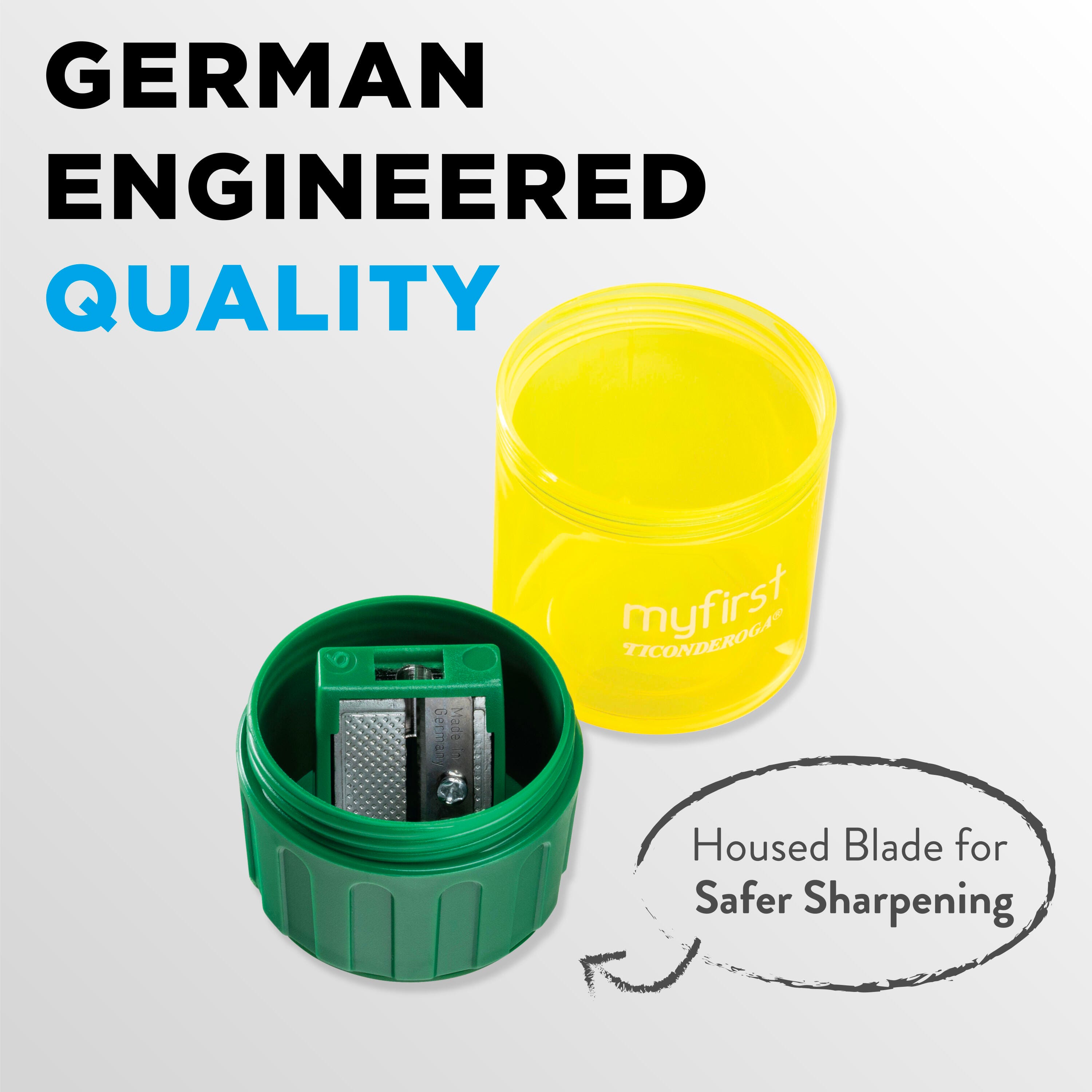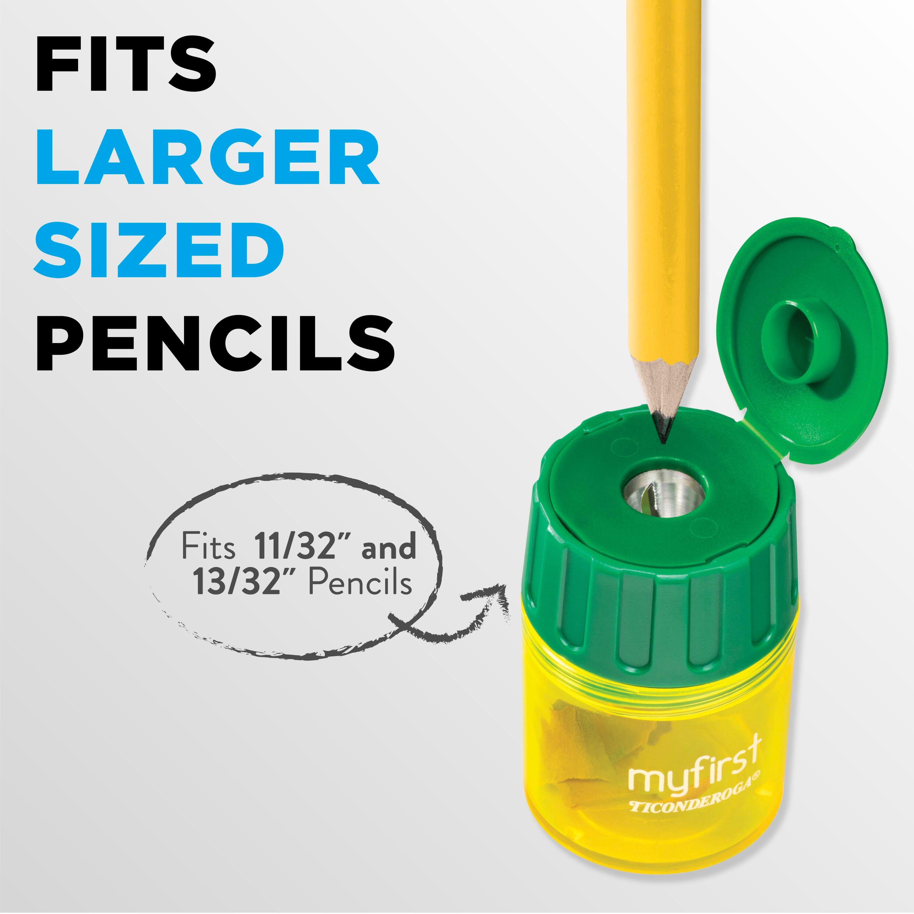 Single hole sharpener fits My First and Laddie pencils. Flip top lid closes tightly and screw-top cover goes on and off easily for emptying and less mess. German engineered quality with long lasting metal blades. Blade placement and housing helps prevent accidental injury. Sharpen 10+ times without emptying large collection cup. Compact size for pencil cases and work stations. 1-1/2 x 2-1/4 x 1-1/2 inches.