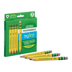 Ticonderoga My First short-length (4-1/2 inch) pencils deliver better control and promote a more natural grip for early learners developing their handwriting skills. The large 13/32 inch diameter reduces writing fatigue and the triangular shape promotes the correct 3-finger grip. These pencils are designed with high-quality materials, including premium wood casings, a soft, thick No 2 graphite core, and latex-free erasers. All Ticonderoga pencils are PMA certified so you can use them with confidence.Features