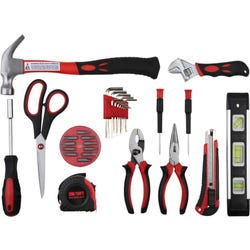 Genuine Joe Tool Kit comprises of 42 tools made of heat-treated carbon steel for maintenance as well as emergencies around the office or home office. This set includes a 6 in adjustable wrench with two-tone handle, 8 oz claw hammer, 6 in long-nose pliers with two-tone handle, slip-joint pliers with two-tone handle, 7 in scissors, a drive handle with 10 bits and a 10 ft measuring tape. This set also includes two precision screwdrivers, one knife with one extra blade, 9 sockets measuring 3/16 in, 7/32 in, 1/4 in, 5/16 in, 11/32 in, 3/8 in, 7/16 in and 15/32 in with a drive size of 1/4 in, 11 hex key wrenches ranging from 9/100 - 1/4 in and one blow-molded plastic case that has a space crafted for each tool.Includes: