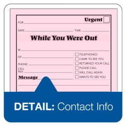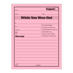 Popular message pad with pink bond sheets helps important messages to stand out on a desk. Design offers efficient message-taking when duplicate copies are not required. Each page includes one note printed in black ink. Each "While You Were Out" note includes an "Urgent" box at the top to check for critical messages. Other boxes to check are for telephoned, "came to see you," "returned your call," please call, will call again and "wants to see you." Each pad includes 50 sheets and is sold as 12 per pack. The pad measures 4-1/4 x 5-1/2 inches.Features
