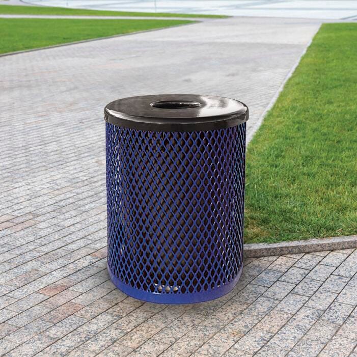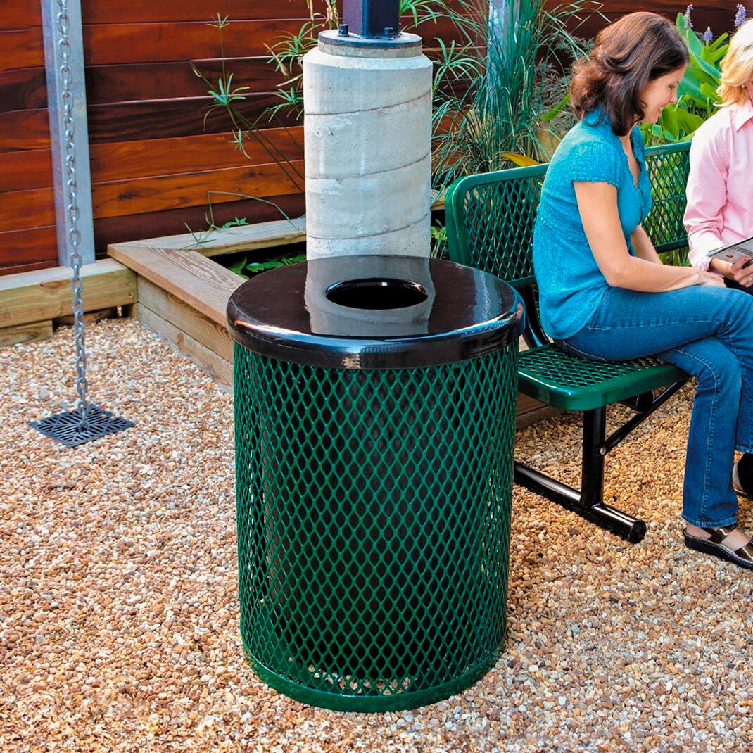 This durable 32-gallon UltraSite Trash Receptacle is easy to maintain and built to last. Available in a classic diamond pattern, this 32-gallon trash receptacle comes in a variety of thermoplastic powder coat finishes to meet the aesthetic needs of your space. No matter what color you choose, this thermoplastic finish will protect your receptacle from rust, weather, and wear. Will complement other outdoor furniture in the UltraSite line. The liner and cover are sold separately. Measures 23-1/4 D x 29-3/4 H inches.Features