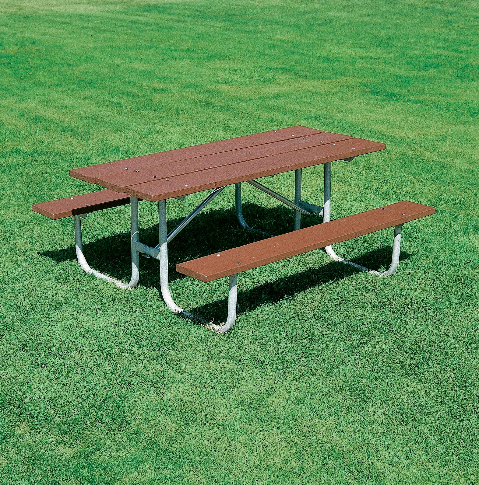 This Heavy Duty Recycled Plastic Picnic Table by UltraSite is the perfect portable picnic table to meet the needs of your dynamic outdoor space. This outdoor picnic table has a rectangular seating pattern, making it ideal for group lunches and activities. Constructed from 100% recycled plastic planks for an environmental furniture solution that is built to blend with your outdoor space. It's held by a galvanized MIG welded frame for sturdy support. This rectangular outdoor table with a walk-through design is specifically designed for heavy-use areas and will not skid even if all persons sit on one side. Some assembly is required.Features