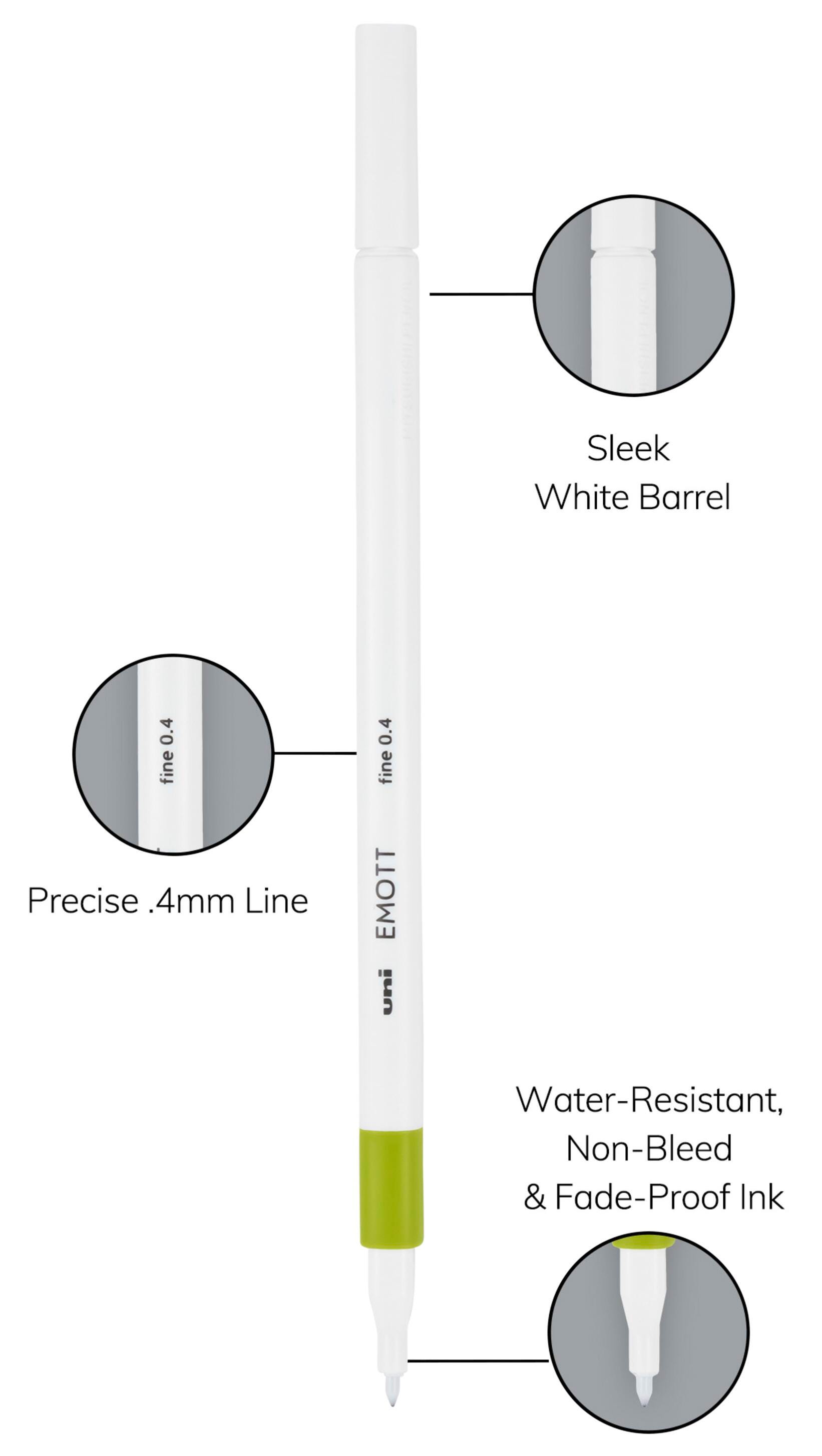 Writings and drawings come to life with EMOTT Fineliner Marker Pens. Ultra-precise, durable tip designed with a protective core prevents bending or splitting, delivering crisp lines with unparalleled definition. Newly developed ink is water-resistant, fade-proof and won’t smear or bleed.