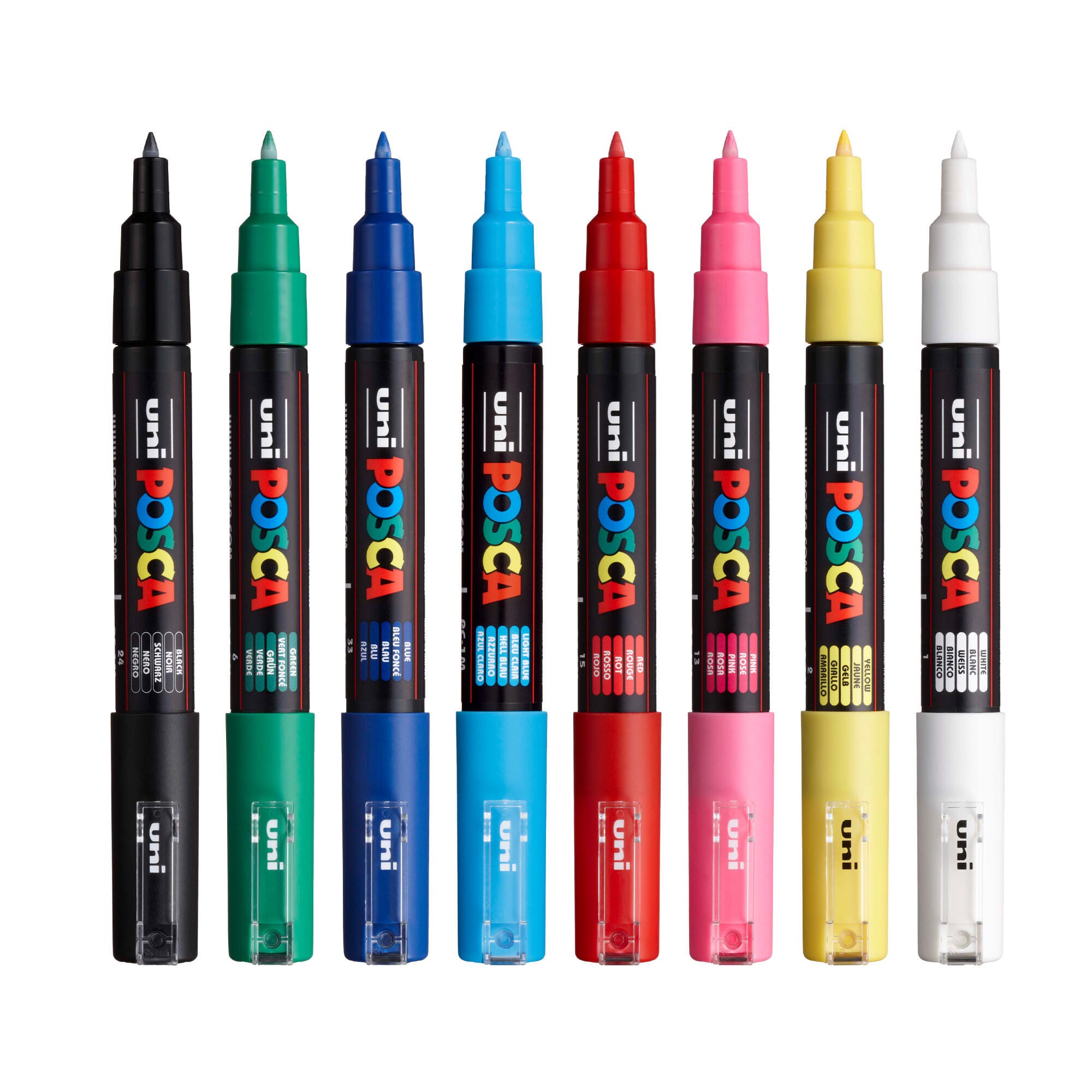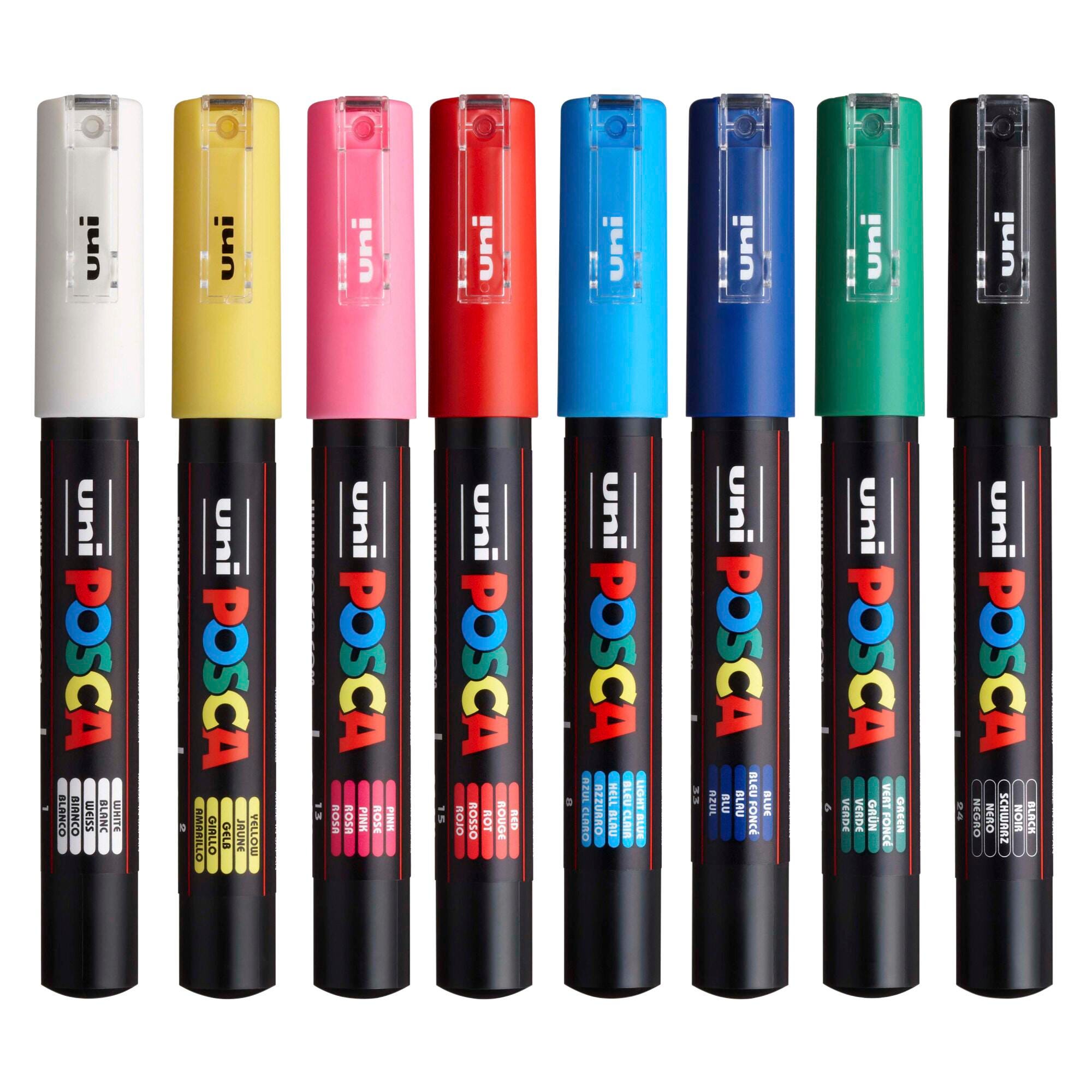Uncap your imagination with uniball's Posca paint markers. This set features the ideal water-based paint marker for customizing or decorating any type of surface. Each art marker is equipped with an extra-fine 0.7mm bullet tip that lays down precise lines and beautiful color for small-format projects. This specialty marker delivers excellent results for all types of users from artists and creative professionals to hobbyists and decorators to surfers and skaters! Every day creatives and budding artists use this paint marker for coloring, drawing, design, customization, and more. The high-quality, water-based paint can be mixed, layered, and diluted to create stunning effects for indoor and outdoor projects. The signature Posca paint is permanent on porous surfaces and erasable on most smooth non-porous materials. This set includes 8 paint markers, 1 each in the following colors: white, yellow, pink, red, blue, light blue, green, and black.Features