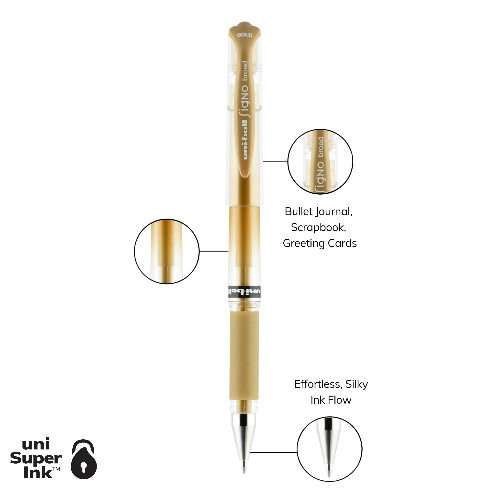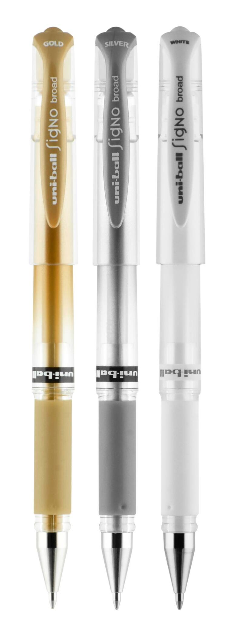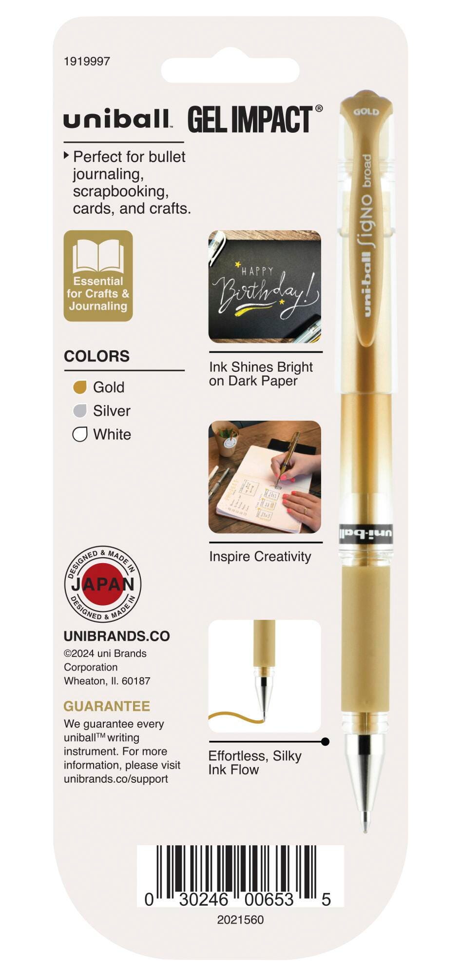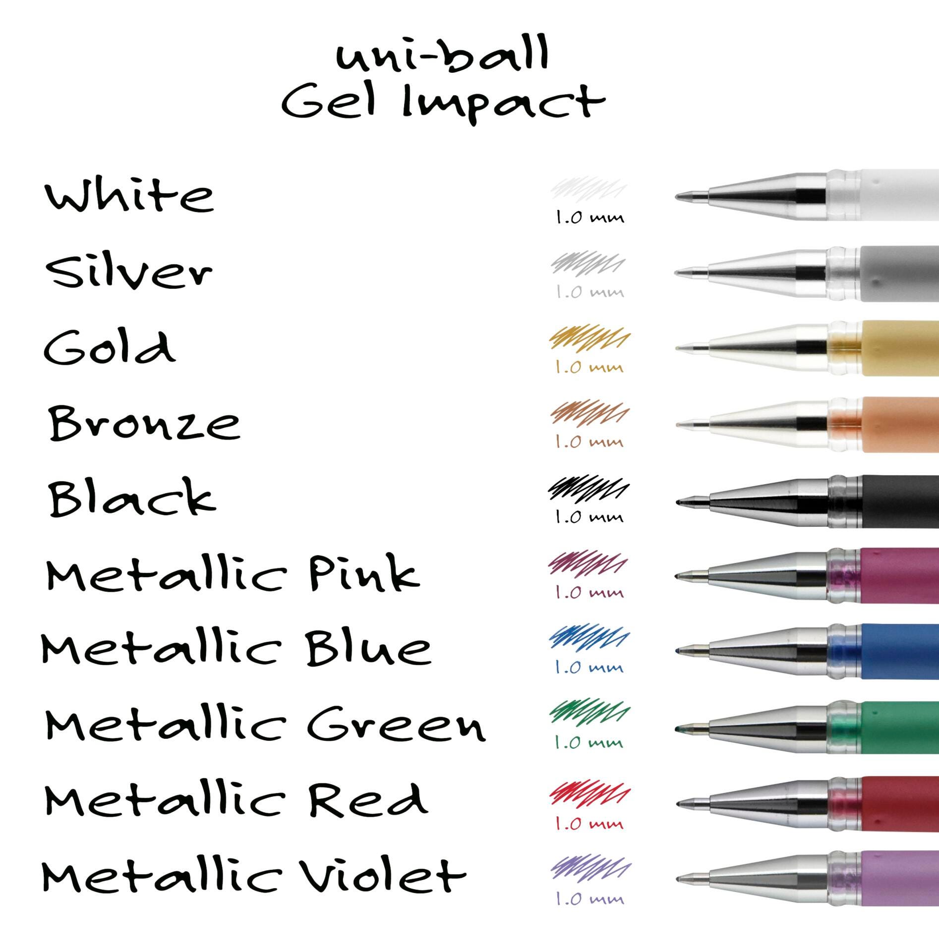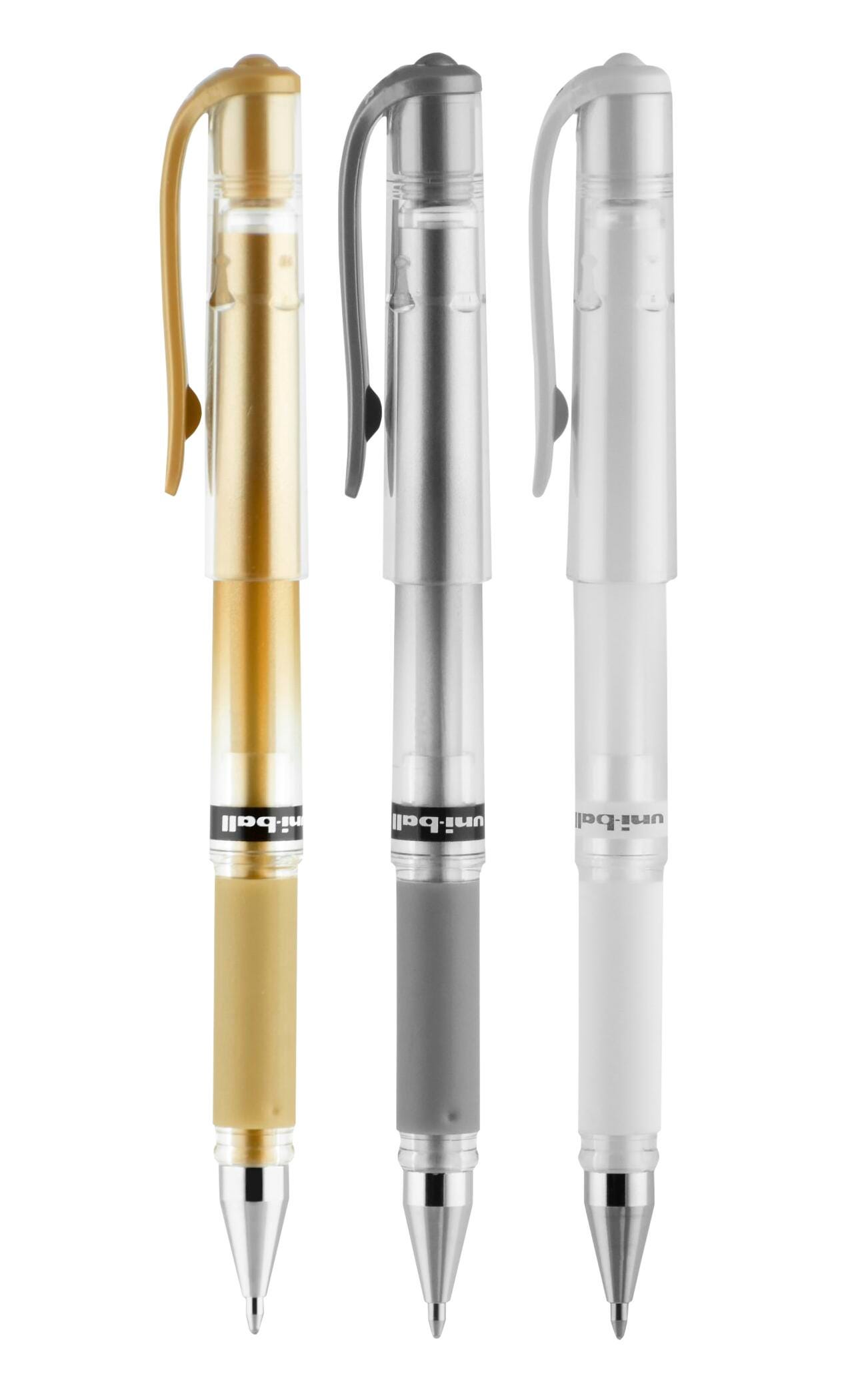The Gel Impact Metallic Stick Pens from uniball™ have bold, vibrant ink that pops on dark paper. The contemporary barrel design with a rubber grip provides superior comfort and control while writing. A partially transparent barrel provides easy viewing of the ink supply. Features uni Super Ink, providing 3-way protection against water, fading, and fraud.