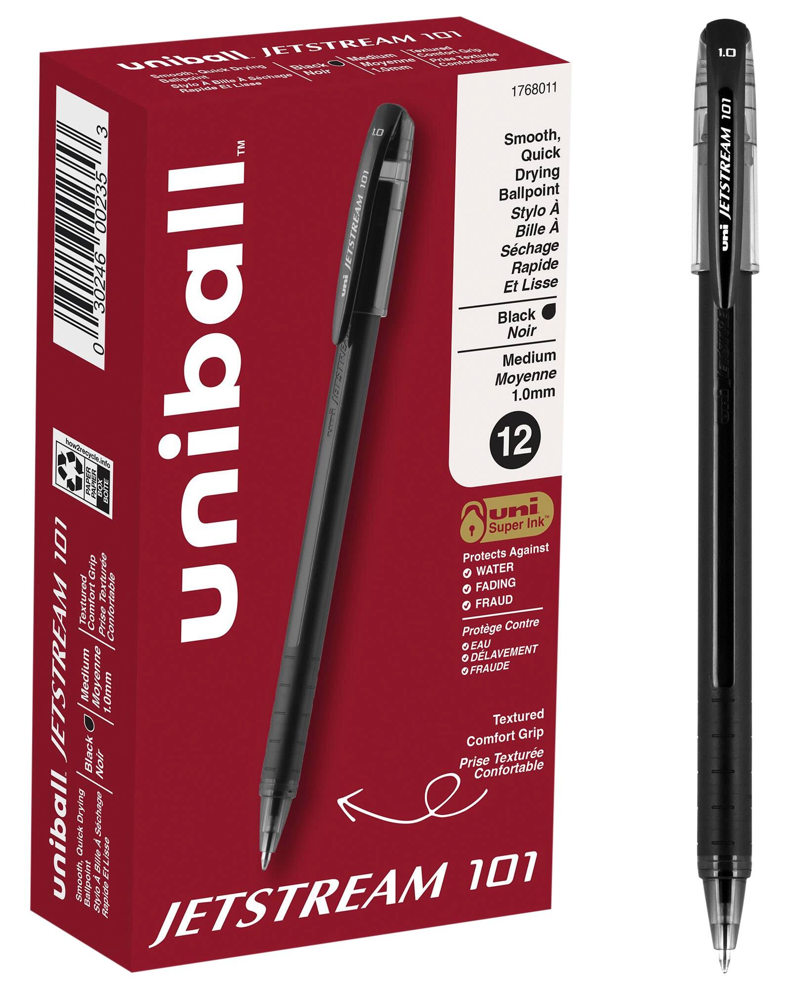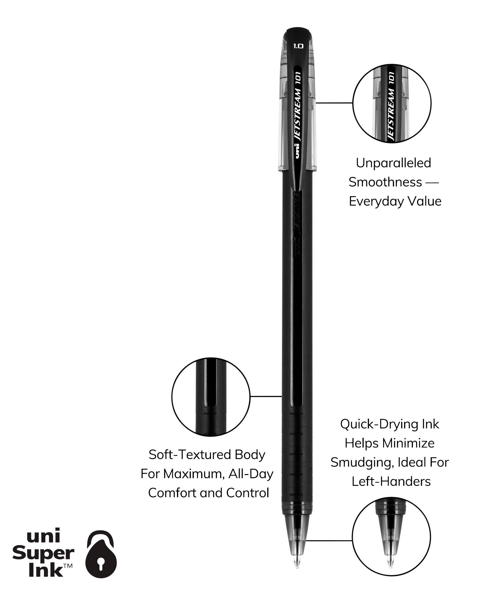 Independently rated as the best pen for everyday use. JETSTREAM with its exclusive, low-viscosity Super Ink combines the quick drying time of a ballpoint with the vibrant color and smoothness of a gel pen. uni Super Ink technology protects against water, fading and fraud.