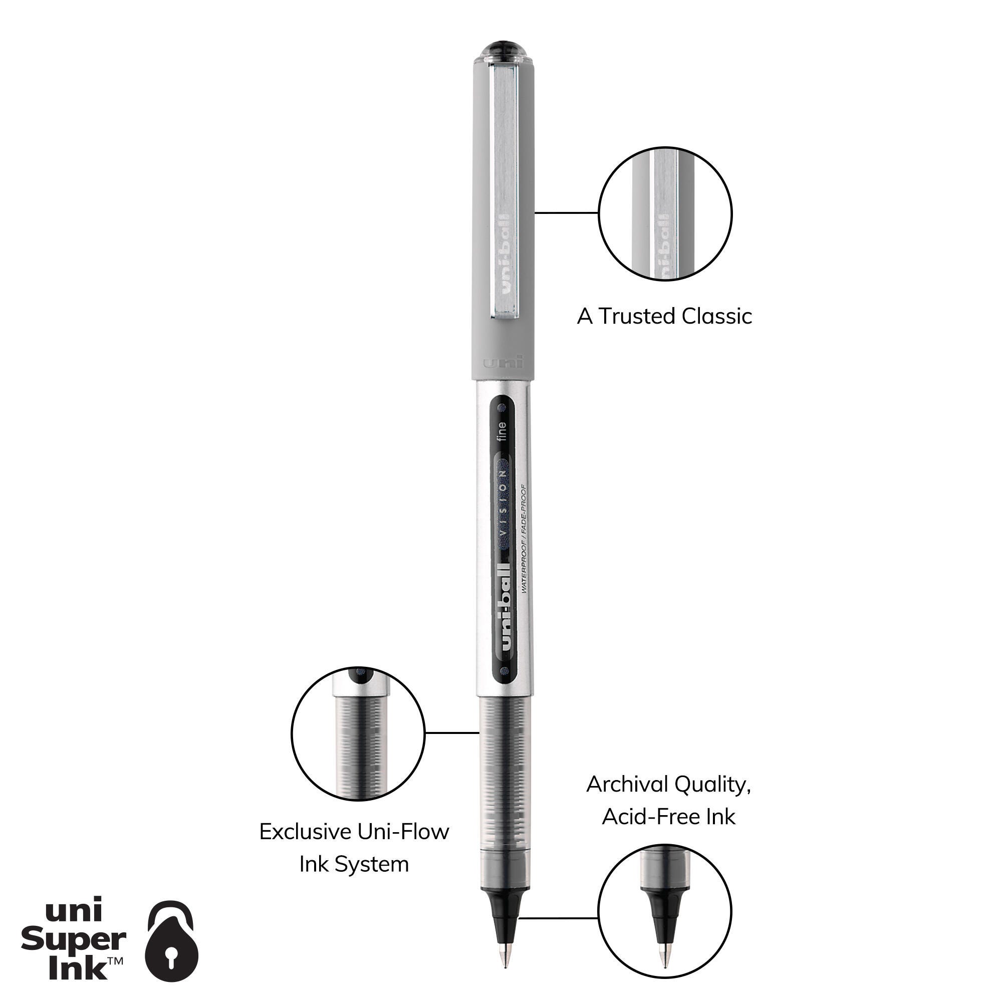 The Rollerball pen has free flowing and fluid ink, similar to a fountain pen. You can actually feel the ball contacting the paper and see the ink flowing out of the pen as you write. Each roller pen features waterproof uni Super Ink which protects against water, fading, and fraud. Archival quality and acid free ink is great for documenting and record keeping. The larger particles deliver solid vivid colors every time you write.
