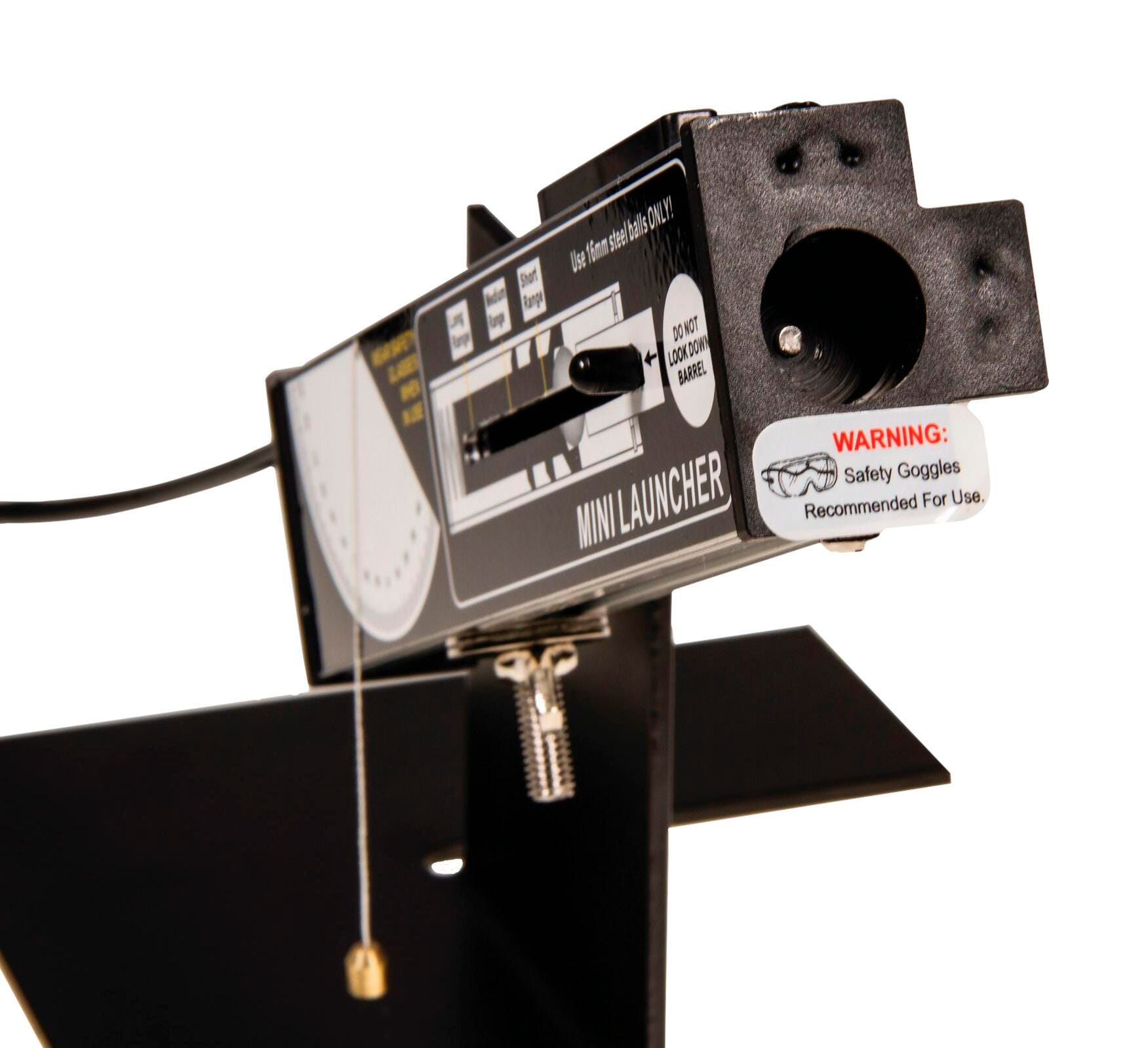 This simple but precise launcher projects 16 millimeters steel balls at ranges suitable for use on the bench top or from the bench to the floor. A protractor and plumb line make it easy to set any required launch angle from 45 degrees downwards to straight up. Three different spring tensions give three repeatable launch speeds (ranges of 1m, 1-1/2 meters and 2 meters) and a magnetic piston ensures that the ball does not touch the side of the barrel and launches straight every time. A cable release gives a smooth triggering to prevent jerking. The unit can stand on its own or be fixed to the bench with a clamp.