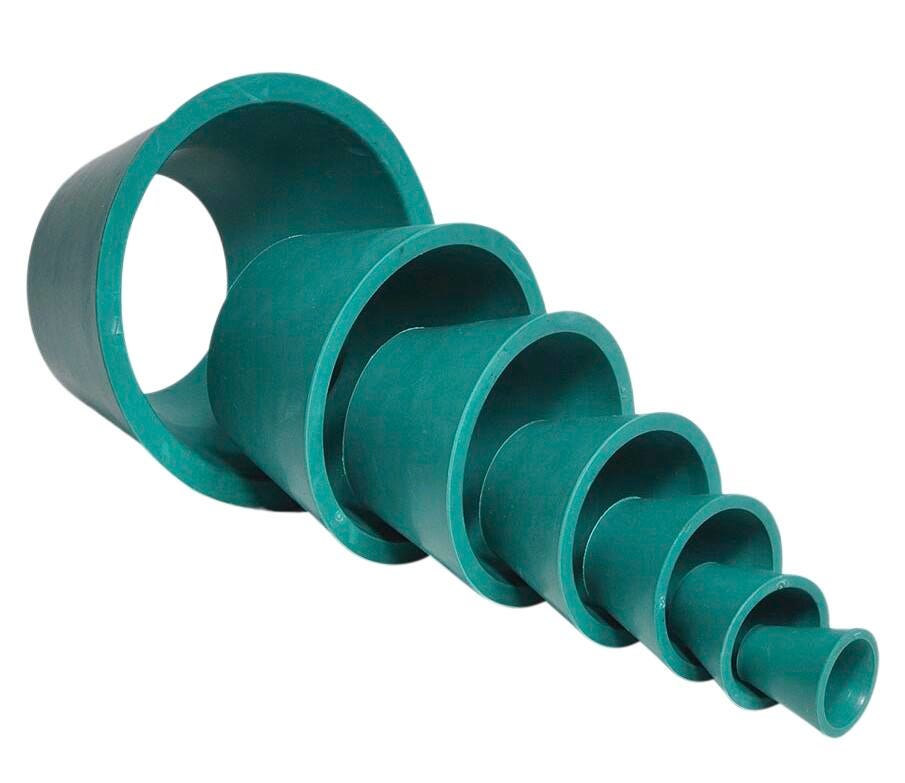 Set of seven synthetic rubber adapter cones designed to fit Buchner and fitted glass funnels, porcelain filters without headpieces, and for reverse flow cleaning of filter crucibles. Adapters can be used to support funnels, Gooch crucibles, filter tubes, and other apparatus in filtration assemblies. These adapters are functional even if not tightly fitted around the funnel stem. Can be used individually or nested with adjacent sizes. Provide an excellent alternative to boring special size holes in rubber stoppers. Autoclavable.
