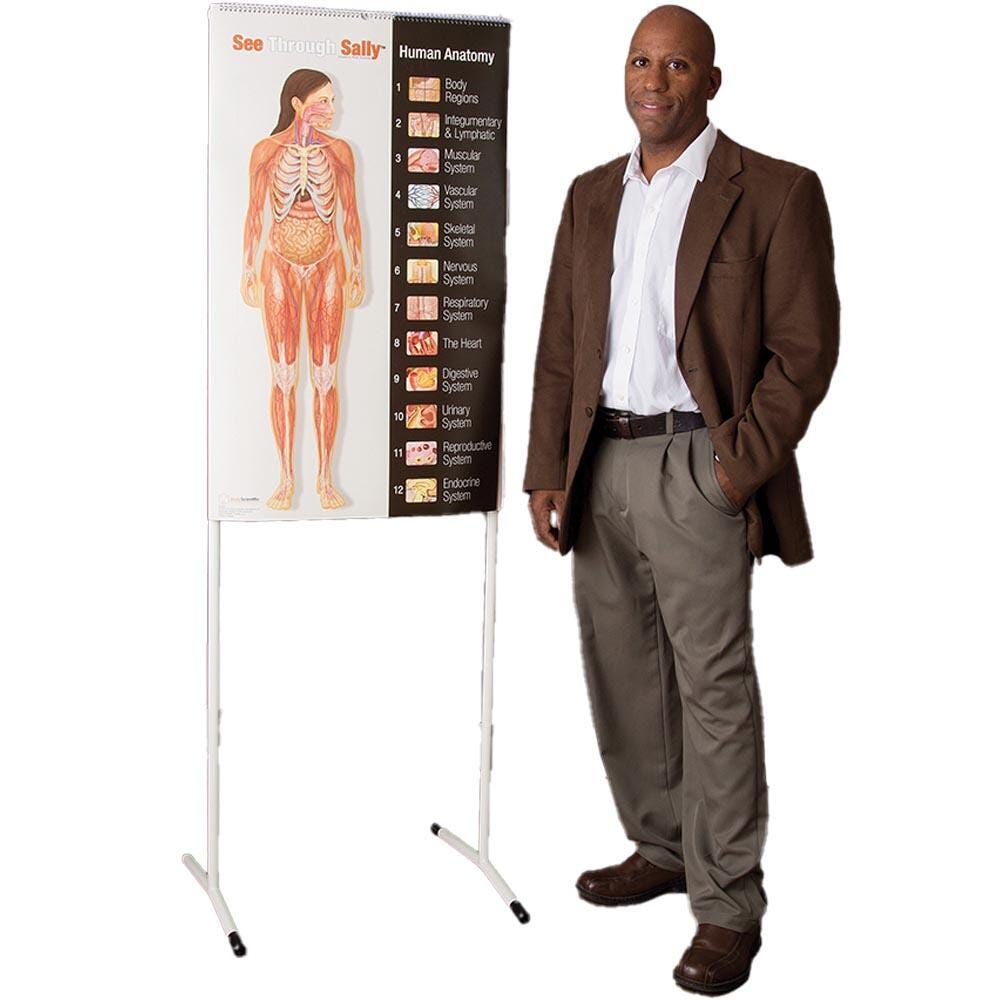 See-Through Sally(TM) provides a memorable visual aid for teaching human anatomy. This set consists of 12 spiral-bound anatomy charts, each representing a different area of the body, mounted on a rigid metal frame and floor stand. Pages begin with the outer layer of the body, and continue through the lymphatic, muscular, vascular, skeletal, nervous, respiratory, heart, digestive, urinary, reproductive, and endocrine systems. The first six pages are full system views, and the next are transparent overlays of internal organs and body systems. Each page includes the full-view of the human body, with all organs in that view numbered sequentially and a number key to make it easy for teachers and students to locate structures. The right side of each page highlights important anatomical features for each system. Dimensions are 22" wide x 36" high. Standing height is 66".