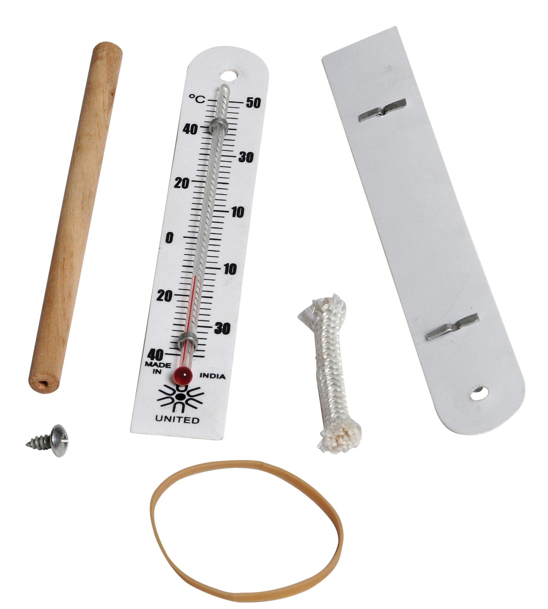 The sling psychrometer includes two plastic-backed Celsius thermometers, one for dry bulb measurements and the other for wet bulb measurements. The thermometers mount on a wooden handle so they can be spun to obtain temperature readings. Includes an activity guide with relative humidity calculation table. Requires assembly.Features