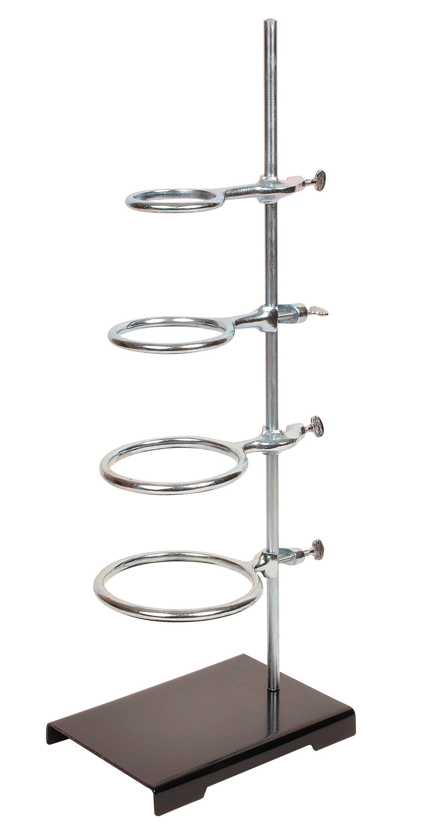 United Scientific Support Stand/Ring Set includes 1 stamped steel base, 4 x 6 inches, 1 zinc-plated steel rod, 18 inches long x 5/16 inches in diameter, 1 cast iron ring with boss head clamp, 3 inches in diameter, and 1 cast iron ring with boss head clamp, 4 inches in diameter.