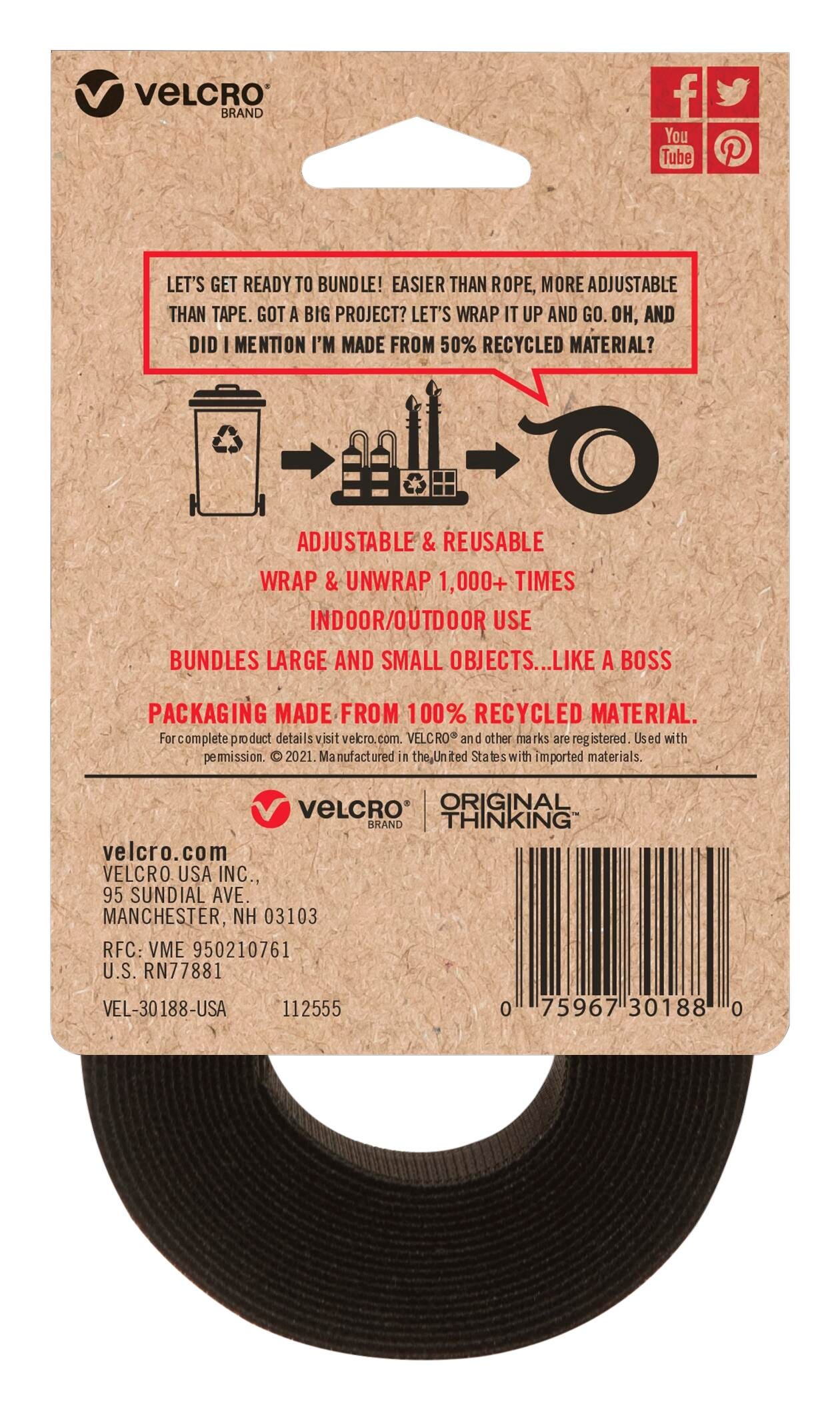 VELCRO Brand ECO Collection Cut to Length Straps, Double Sided Roll, 1 Inch X 10 Feet, Black