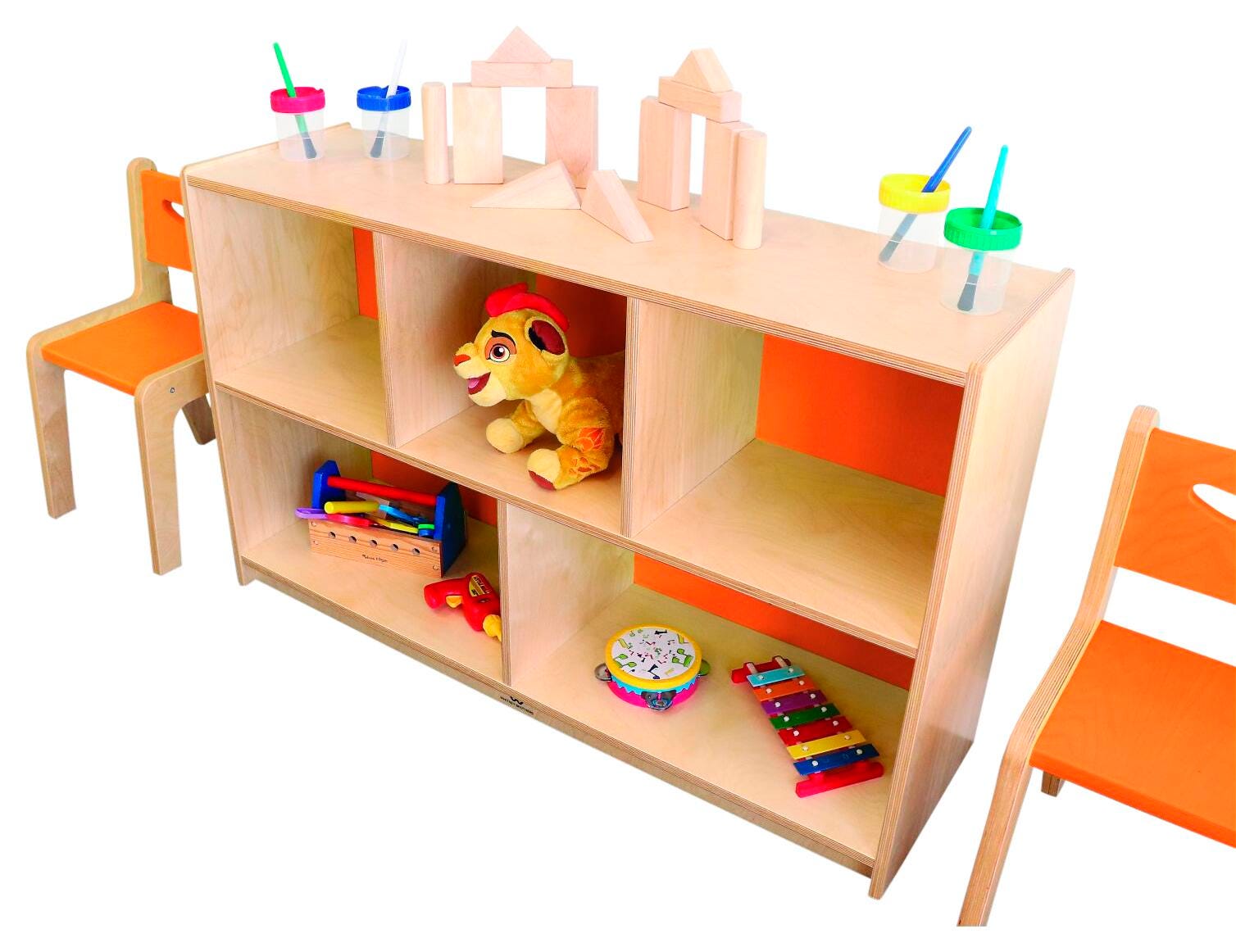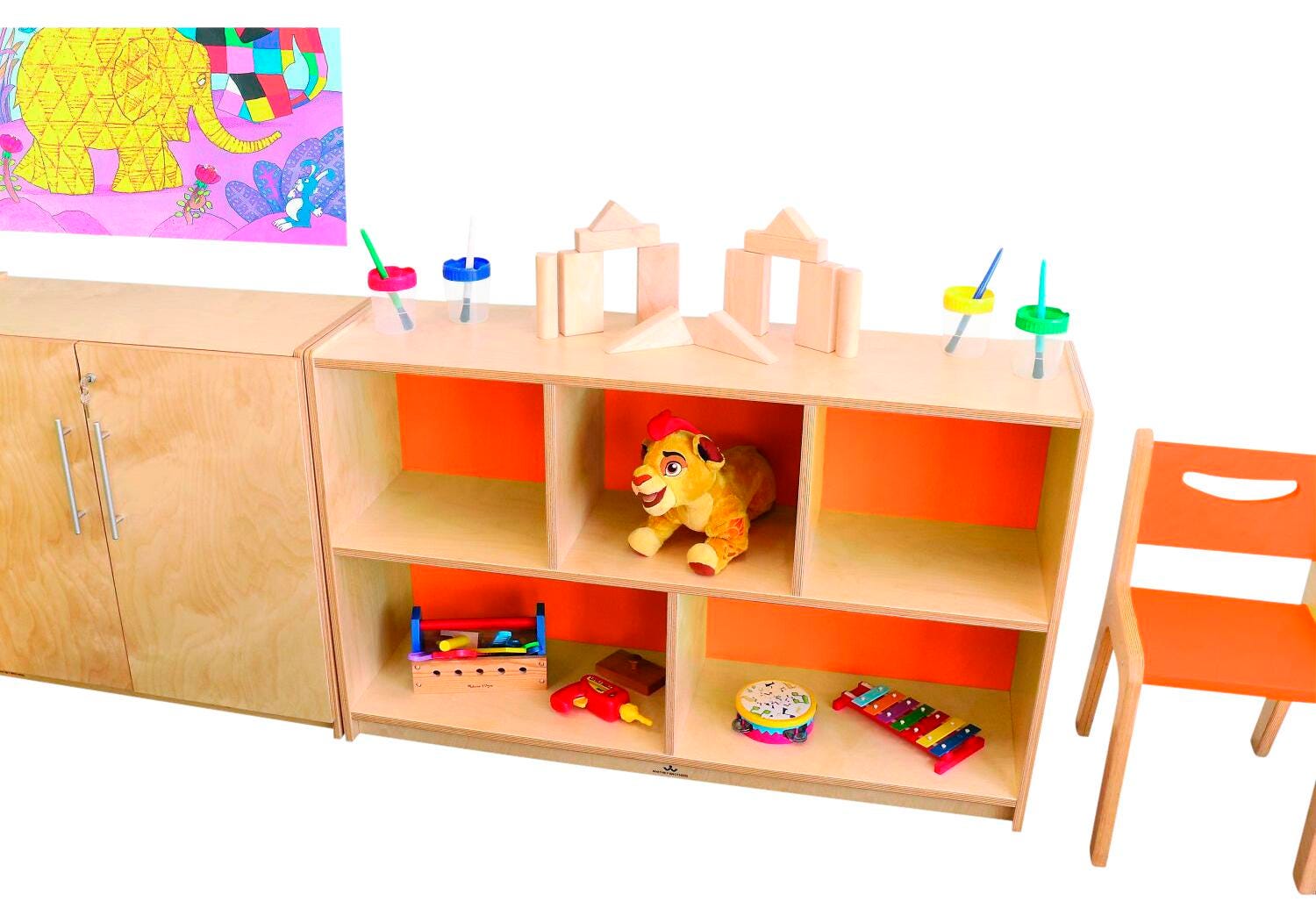 Our stylish, functional, heavy duty Whitney Plus cabinets are crafted in beautiful ¾-inch birch plywood and are made even more sturdy with 1/4-inch birch plywood back panels, not MDF or particle board. The cabinet back has the same custom color on both sides so you can coordinate with our Whitney Plus tables and chairs to brighten any indoor environment.Features