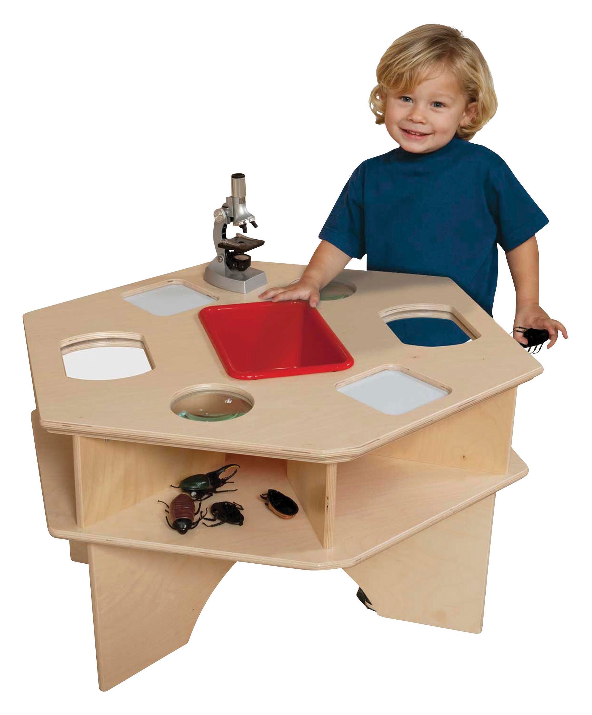 Deluxe six sided table provides ample space for scientific exploration by utilizing magnetic marker boards, magnifiers, and mirrors. Red cubby tray included for storage. Constructed from 100 percent Plywood, and coated with our exclusive Tuff Gloss UV finish. Fully rounded corners and edges for maximum safety. 27 W x 30 D x 20 H inches. Simple feet attachment required. Lifetime warranty.Features