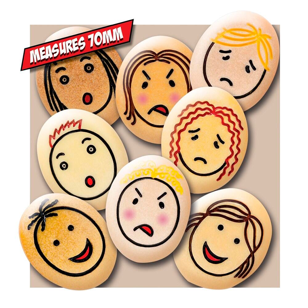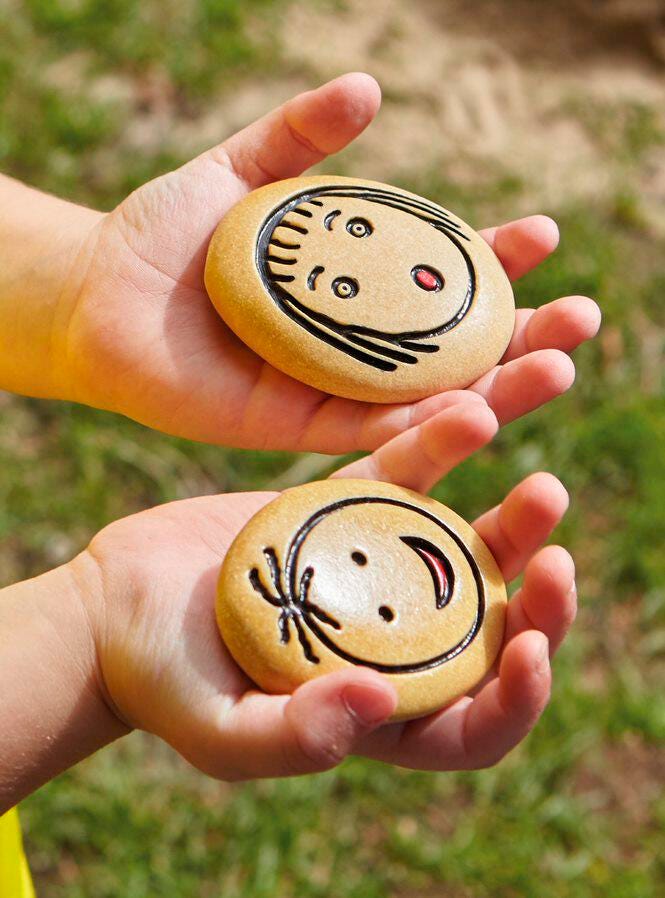 The set of eight large stones feature the four emotions that young children most readily identify and experience: happy, sad, surprised, and angry. Each durable and washable stone measures approximately 2-1/2 inches and are safe for small hands to explore. They are cast from our unique stone mix and can be used outdoors and in sand and water.Features